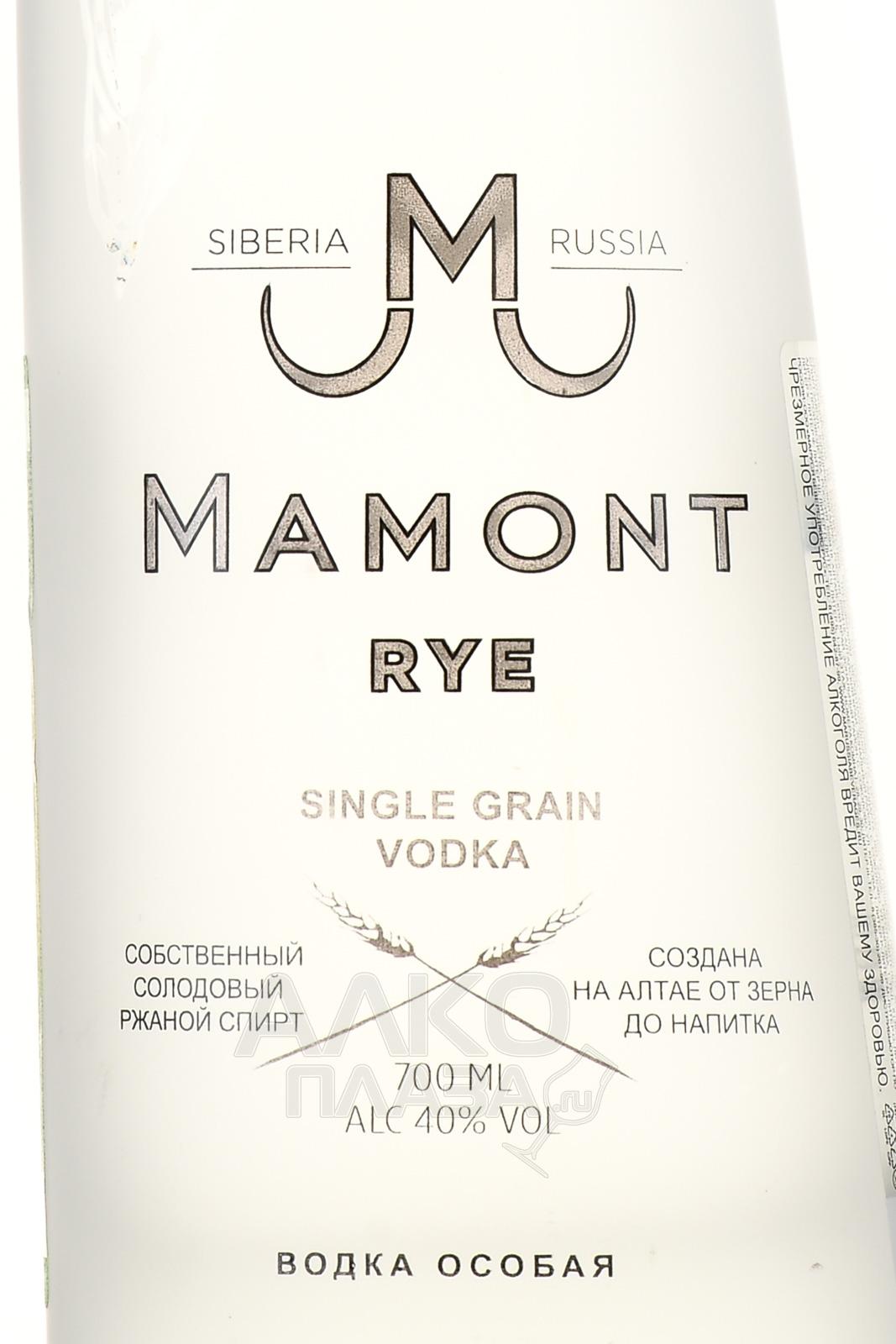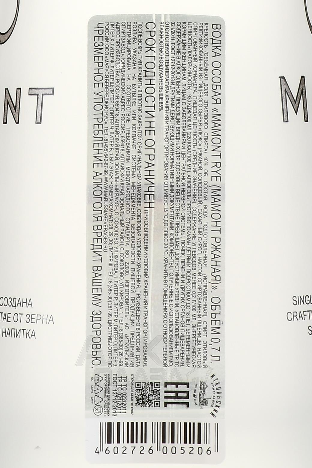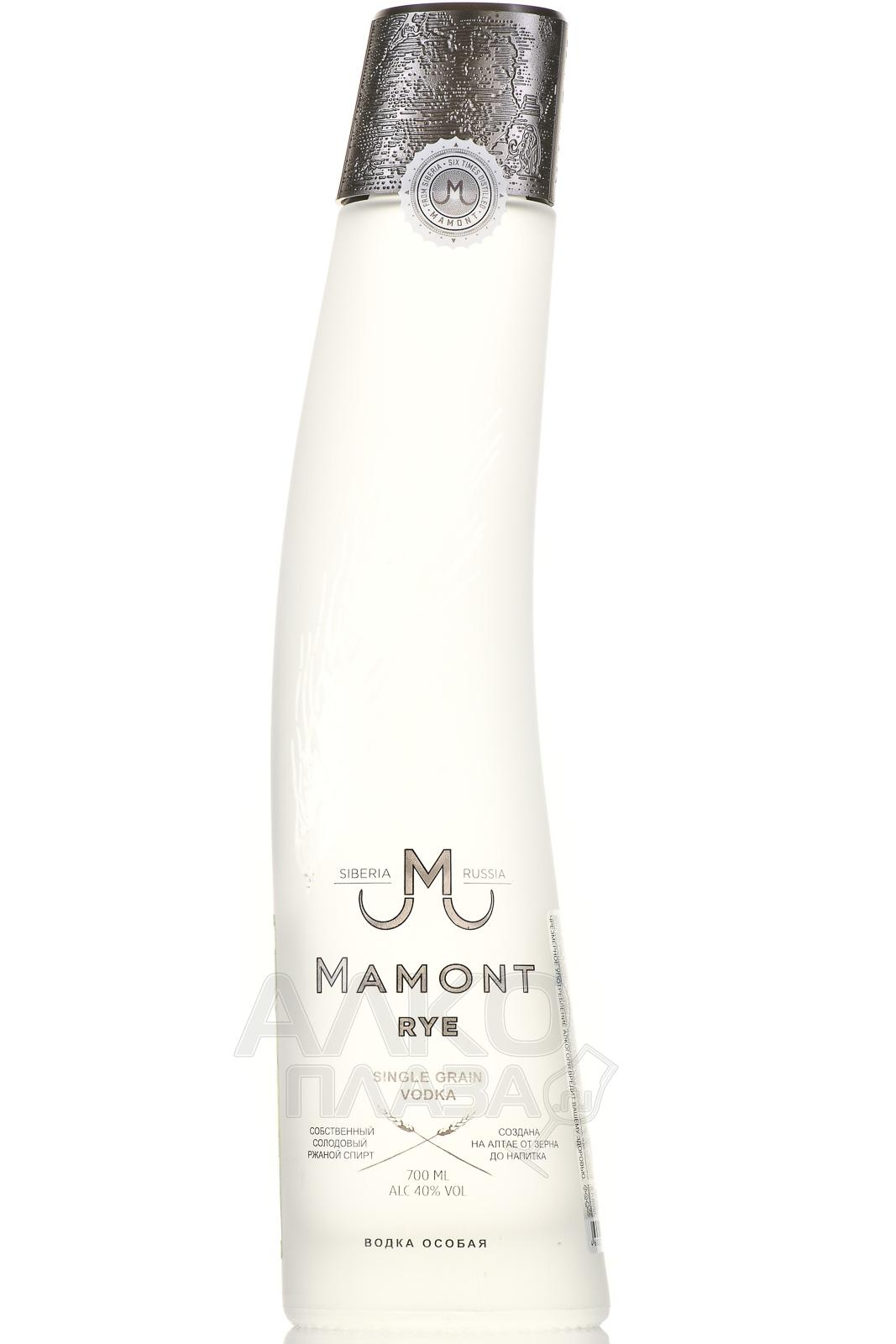 Водка Mamont Rye 0,7 л изготовлена на мощностях Иткульского спиртзавода из натуральных составляющих природного происхождения: тщательно отобранной ржи и родниковой алтайской воды. Сырье подверглось ректификации в классических колоннах и редукции градуса до требуемых сорока процентов. Перед розливом по стильным матовым бутылкам в виде бивней мамонтов водку отфильтровали с применением березового угля, обогащенного ионами серебра. Благодаря необычной упаковке и гарантированному качеству, напиток можно назвать беспроигрышным вариантом подарка.