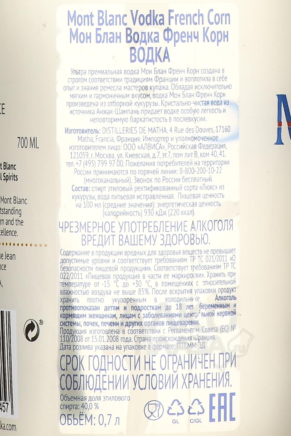 Mont Blanc French Corn - водка Монблан Френч Корн 0.7 л
