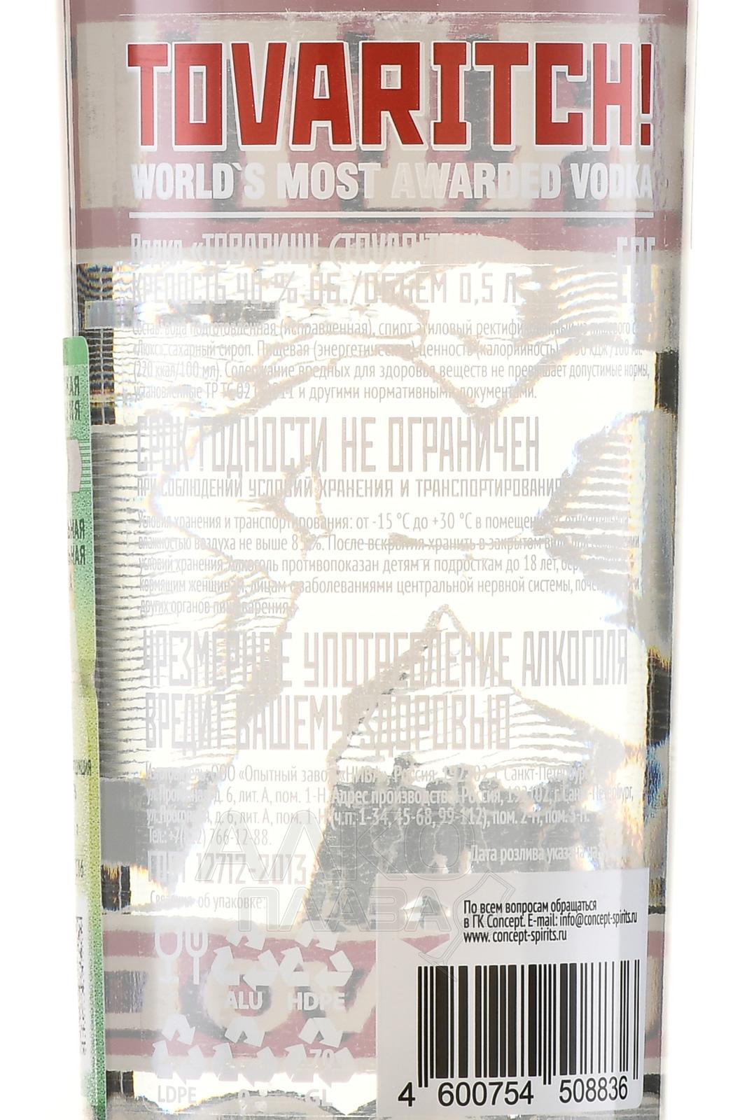 Водка Tovaritch 0,5 л создана в классическом русском стиле с акцентом на чистоту и мягкость. Для ее производства используется многоступенчатая система фильтрации, включающая уголь и серебро, что придает напитку особую прозрачность. Сырье проходит строгий контроль качества, а зерновая основа обеспечивает гармоничный вкус без резких нот. Эта водка получила признание на международных конкурсах и отмечена множеством медалей, что подтверждает высокий уровень. Критики отмечают стабильность качества и характерную утонченность вкуса, благодаря чему Tovaritch заняла достойное место в рейтингах лучших образцов своей категории.