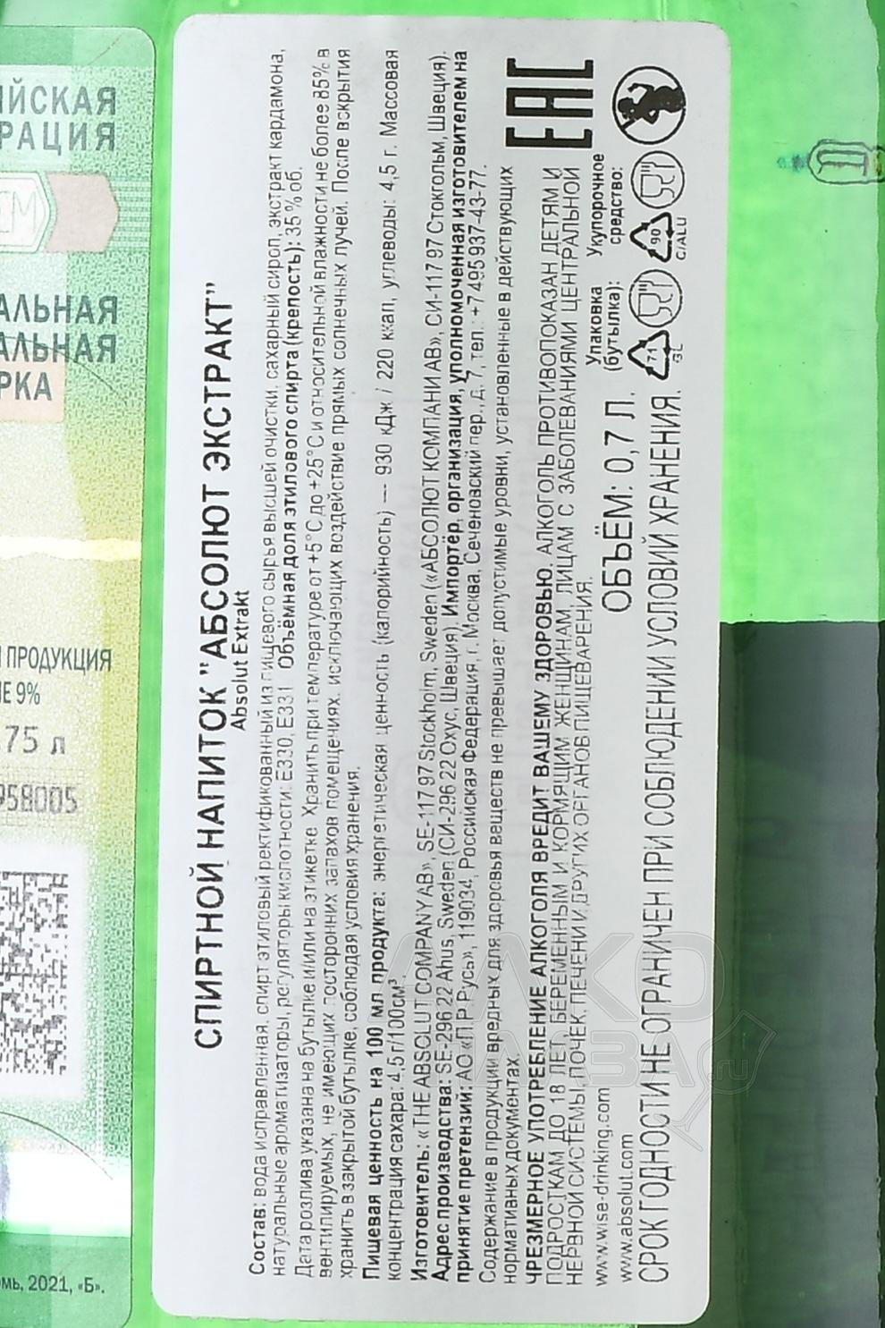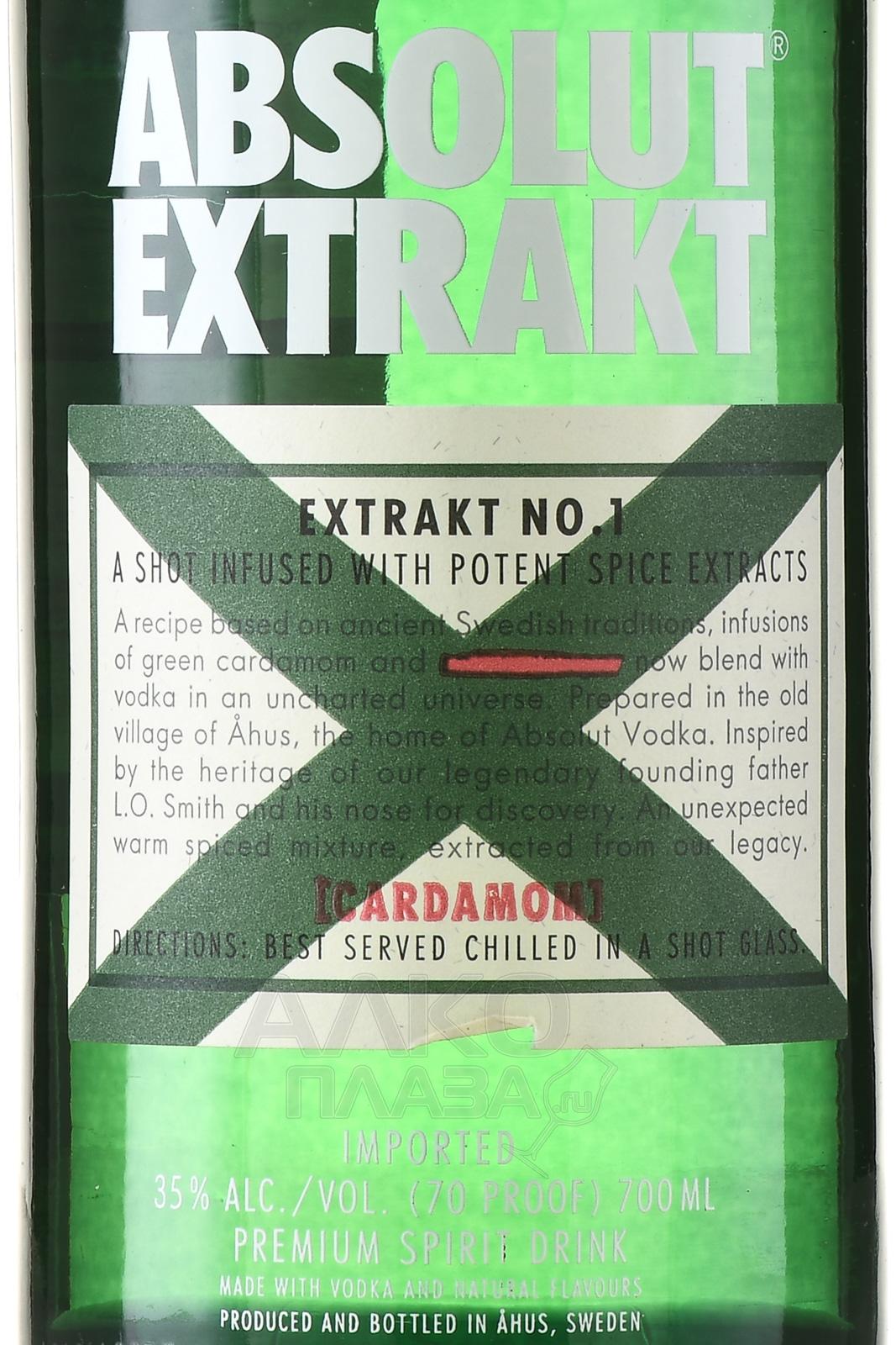 Водка Absolut Extrakt 0,7 л — премиальная, с эффектным оформлением и оригинальным пряным вкусом. Она создавалась на базе пшеничного спирта (из озимого зерна) с добавлением натурального экстракта кардамона. Зеленая бутылка с округлыми очертаниями и крестом на этикетке напоминает старинные емкости, в которых когда-то продавали лекарства в аптеках. К этой категории как раз и относились изначально спиртовые пряные настойки.