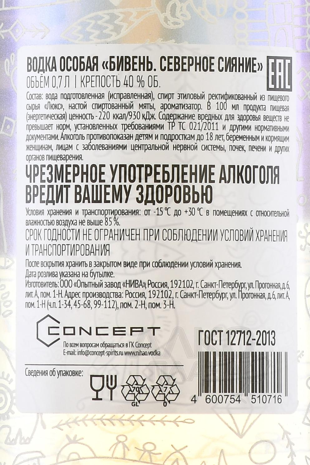 Водка Бивень Северное сияние 0,7 л создана в современном стиле с акцентом на чистоту и свежесть вкуса. Напиток производится на основе отборного зернового спирта и чистейшей воды, прошедшей многоступенчатую фильтрацию. Также добавляется натуральный настой мяты. Технология предусматривает дополнительную обработку, что делает вкус мягким и сбалансированным. Уникальность этой водки подчеркивается концепцией, связанной с северной природой и символикой сияния, что отражено и в дизайне бутылки. Напиток получил положительные отзывы за гармонию аромата и вкуса, а также за характерную узнаваемость бренда. Бутылка оформлена в светлых тонах, что усиливает ассоциацию с природным явлением, вдохновившим создателей.