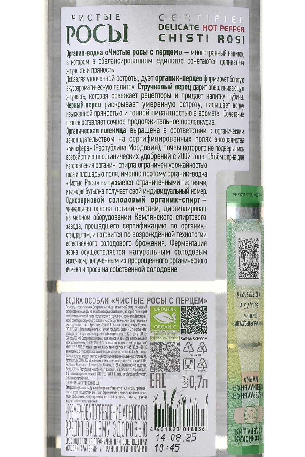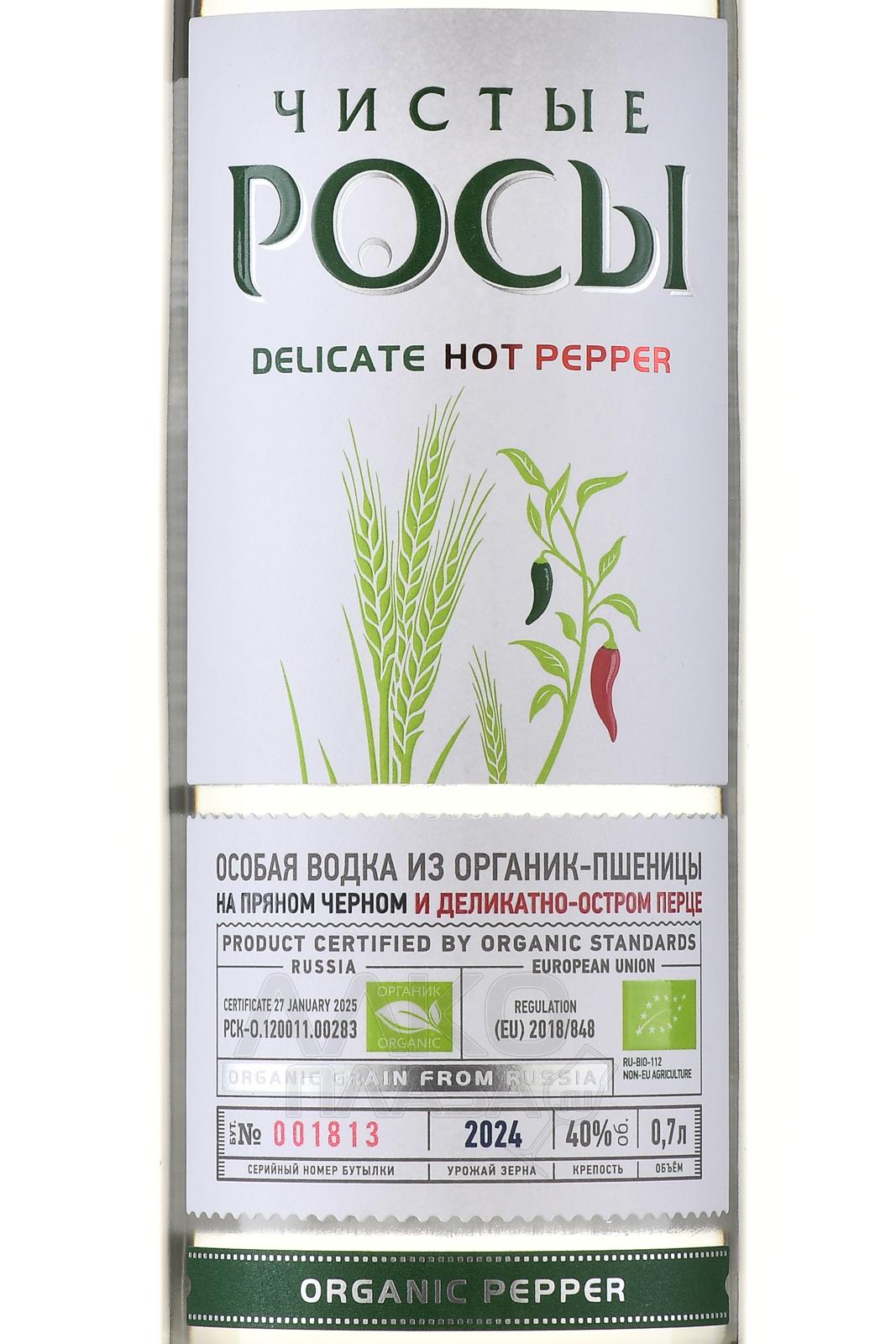 Водка Чистые Росы с перцем 0,7 л создана на основе зернового спирта высокой очистки и чистейшей родниковой воды. Она отличается мягким, но выразительным характером с ярким пряным акцентом. В многогранном вкусе переплетаются узнаваемые нюансы жгучего стручкового перца и мягкая остротой черного. Производство проходит по современным технологиям с бережной фильтрацией, что сохраняет насыщенность букета и придает напитку сбалансированность. В роли сырья выступает органическая пшеница, выращенная на сертифицированных полях хозяйства «Биосфера» в Республике Мордовии. Уникальность этой водки заключается в ограниченной партии выпуска, органическом характере и добавлении натуральных спиртовых перечных настоев.