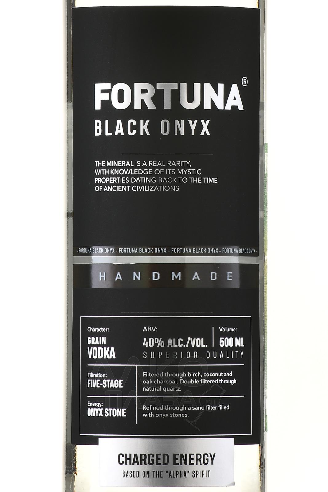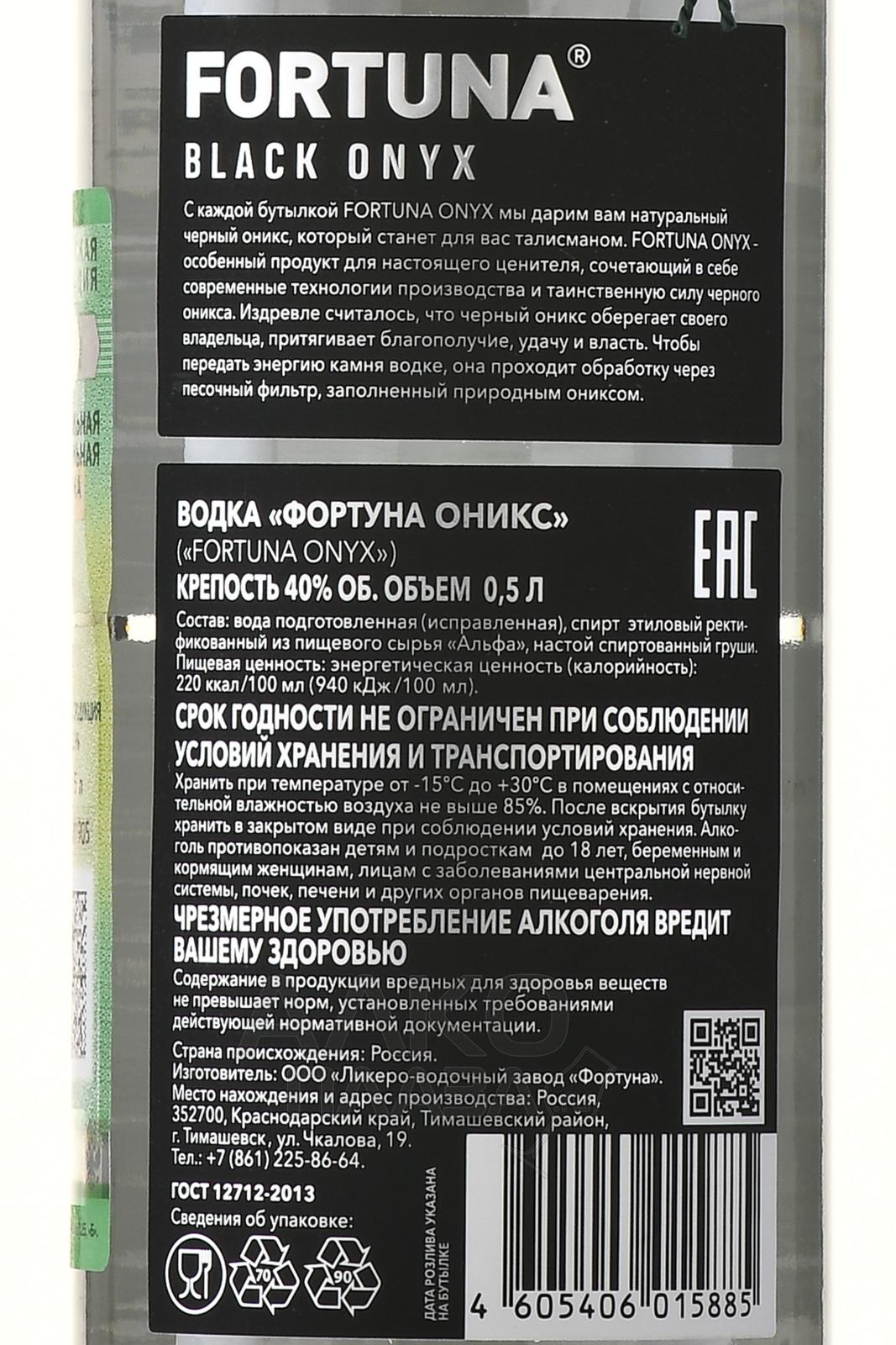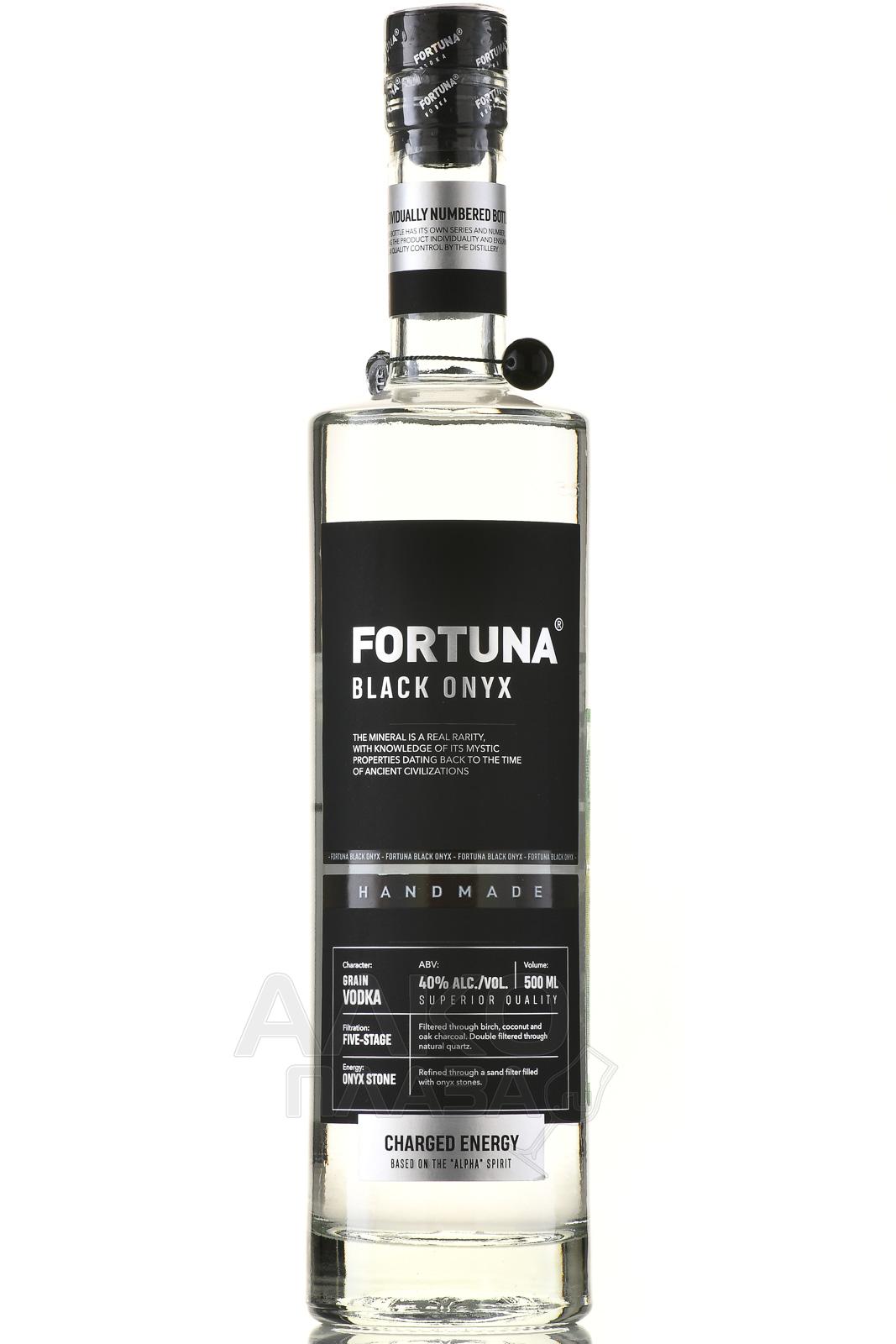 Водка Фортуна Оникс 0,5 л — премиальный алкоголь с оригинальным, эффектным оформлением, который стоит выбрать в качестве праздничного презента. Производство базируется на классическом рецепте, но имеет свои уникальные особенности. В роли основного ингредиента фигурирует спирт «Альфа» из отборной пшеницы, изготовленный по технологии ректификации и прошедший очистку с помощью сложной системы фильтров. Его пропускают через слой песка, смешанного с частицами оникса, и активированный уголь. В водку добавляется спиртовой настой груши. Крепость 40% достигается за счет купажирования умягченной водой. Алкоголь поставляется в высокой прозрачной бутылке с черной этикеткой, на горлышке которой закреплен брелок из черного оникса — этот минерал привлекает удачу и благополучие.
