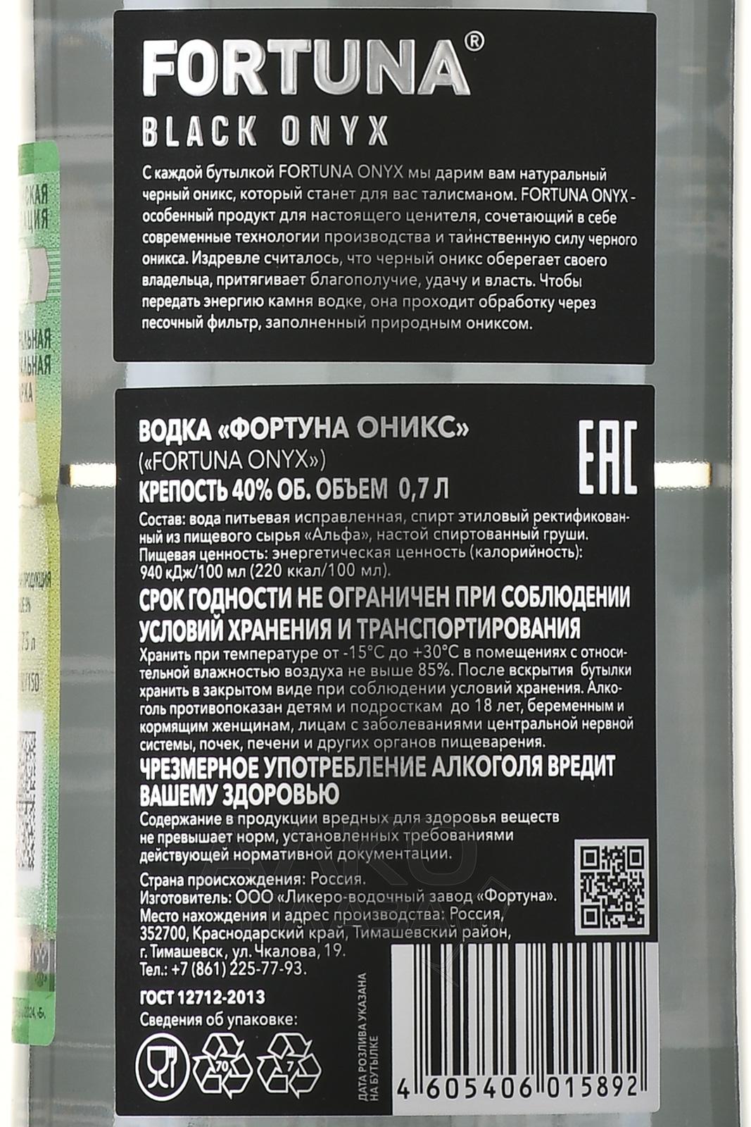 Водка Фортуна Оникс 0,7 л создается на базе классической технологии, в которую производитель привнес собственные ноу-хау. Алкоголь премиальной категории содержит пшеничный ректификованный спирт категории «Альфа» и настой груши. Напиток очищают с помощью уникальной системы: сначала пропускают через слой песка, смешанного с частицами оникса, а затем через угольные фильтры. Водка разливается в прозрачные бутылки стильной формы с черными этикетками. На горлышке закреплен брелок из натурального черного оникса — этот подарок-талисман принесет благополучие и удачу владельцу.