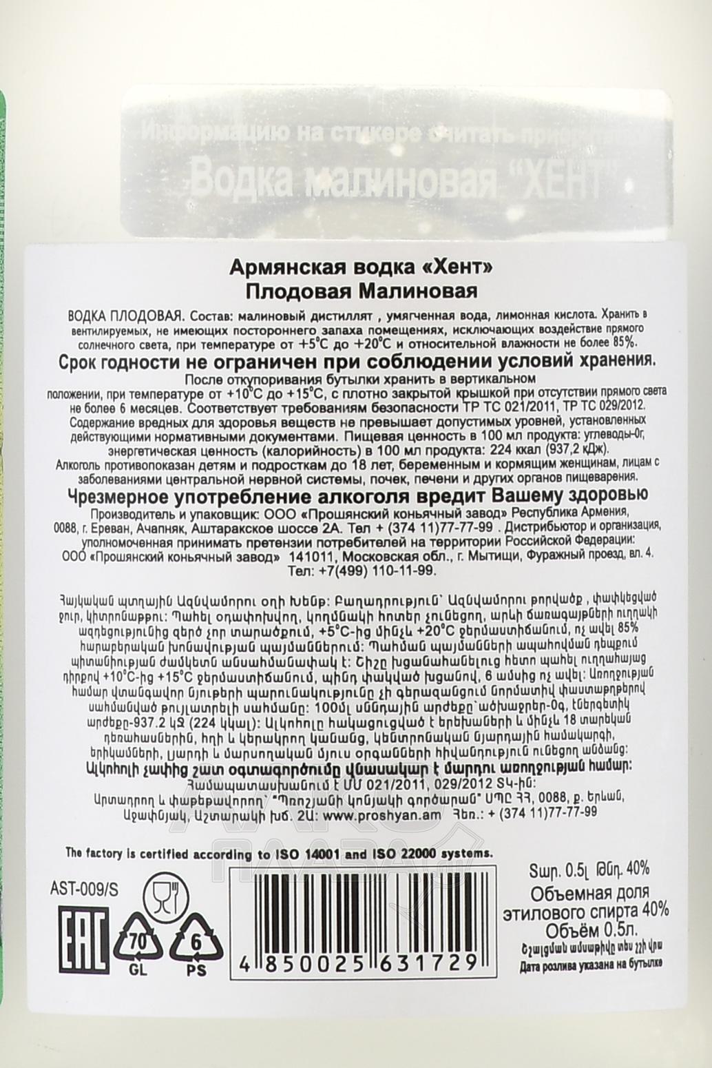 Водка Плодовая Хент Малиновая 0,5 л — это армянский фруктовый дистиллят, произведённый на Прошянском коньячном заводе. Для её создания используется малина, собранная вручную на склонах Тавушской области. Созревшая в экологически чистых условиях ягода подвергается ферментации и дистилляции, что позволяет сохранить её натуральный вкус и аромат. Бутылка из матового стекла подчёркивает премиальный характер напитка.