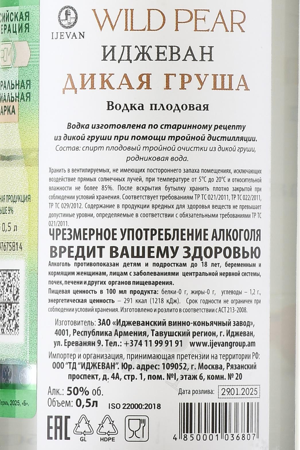 Водка Дикая груша Иджеван 0,5 л — армянский напиток высокой крепости (50 градусов), который был произведен на Иджеванском винно-коньячном заводе из свежего плодового сырья. Изготовление спиртного протекало по следующей схеме: из груш аккуратно отжали сок путем прессования на современных установках, после чего он ферментировался и перегонялся три раза. Выдержка не выполнялась.