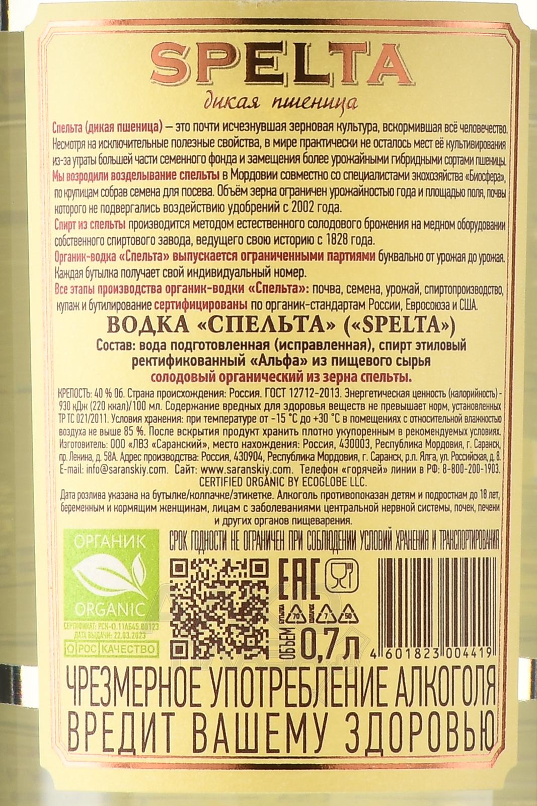Водка Спельта производится Саранским ЛВЗ из зерен дикой пшеницы — спельты, в честь которой торговая марка получила название. Данная культура богата аминокислотами и имеет сертификат органической продукции европейского образца. Изготовление сорокаградусного напитка премиум-класса прошло по технологии ректификации с добавлением чистейшей родниковой воды с богатым минералами составом.
