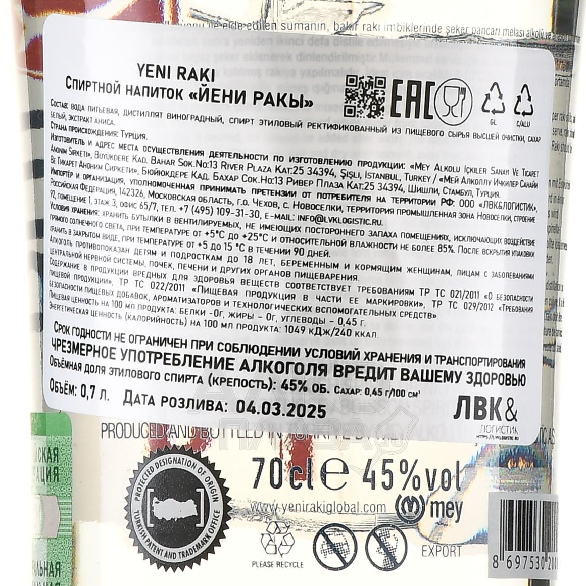 Водка плодовая Yeni Rakı 0,7 л — легендарный турецкий напиток, олицетворяющий собой более чем пятисотлетнюю историю производства. Он создается из свежего и сушеного винограда. Сырье выращивается в Анатолии — центральном регионе страны, спирт из него получают путем двойной перегонки с добавлением аниса высшего качества. Благодаря этому Йени Ракы обладает мягкостью и узнаваемым ароматом, который невозможно спутать с другими анисовыми дистиллятами. Производство строго следует традиционным методам, очень важны чистота ингредиентов и природная вода. Yeni Rakı гордо представляет Турцию на международных конкурсах и отмечен множеством наград, включая золото San Francisco World Spirits Competition и серебро SIP Awards. Это не просто алкоголь, а символ анатолийского гостеприимства и региональной культуры.