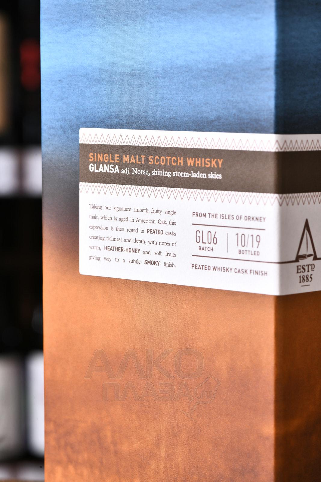 Glansa в переводе с древнескандинавского, можно перевести как «проблески света в штормовом небе». По словам мастера перегонки вискокурни Scapa -Брайана МакОлей, характер виски отражает суровый дух Оркнейских островов, где полный штиль может мгновенно обратиться суровым штормом.