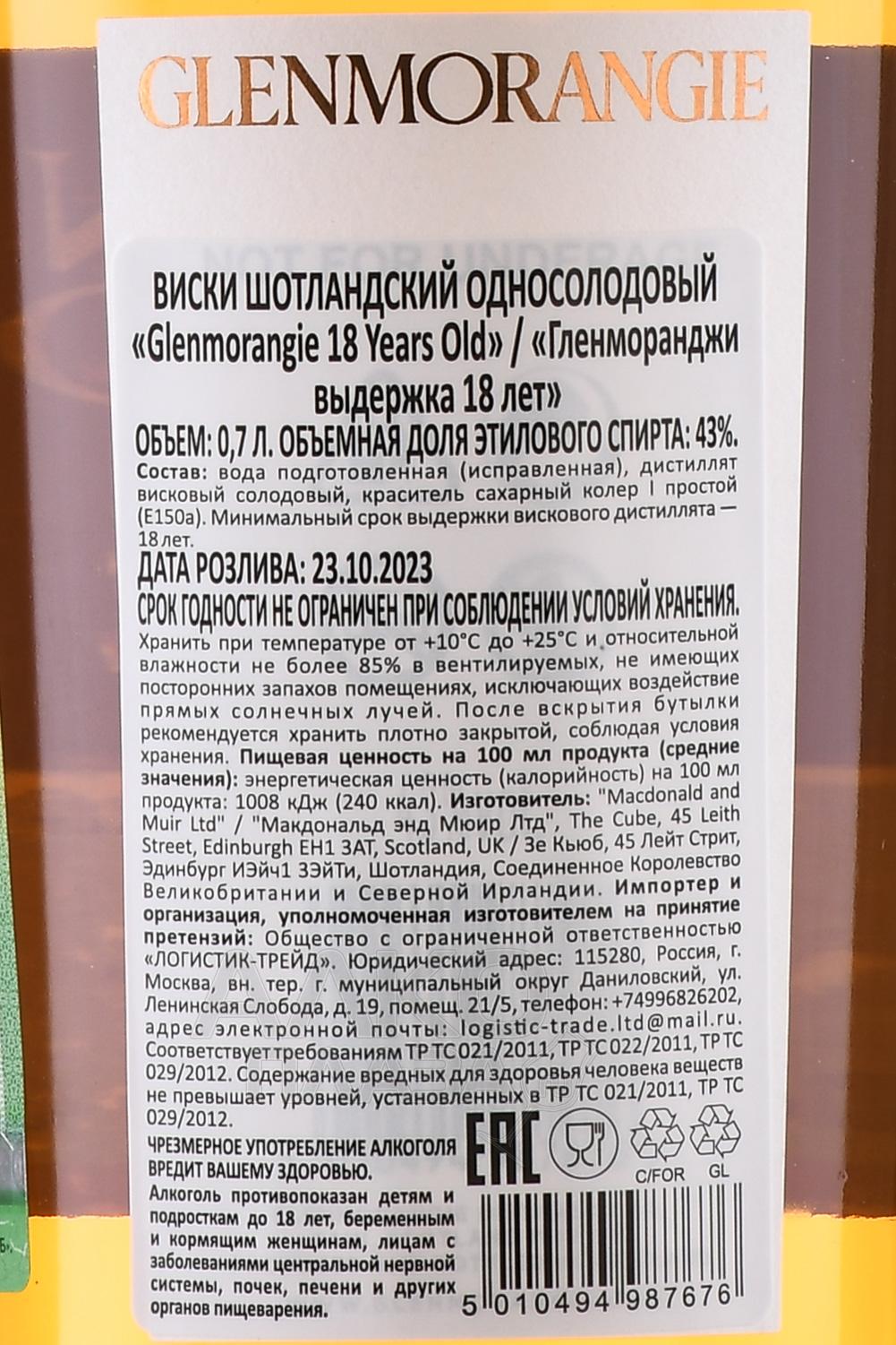 Виски Glenmorangie 18 years 0,7 л в п/у представлен купажом выдержанных солодовых дистиллятов. Он признан знатоками всего мира и обладает множеством наград. Напиток имеет неповторимый вкусоаромат, сформированный поэтапной выдержкой. Спирты созревает в дубовых бочках из-под бурбона, а по истечении 15 лет примерно треть из них переливается в емкости второго наполнения из-под хереса. Спустя три года дистилляты смешиваются, напиток подвергают холодной фильтрации и разливают по бутылкам. 18-летний скотч предлагается в подарочной упаковке и подходит на роль статусного презента.