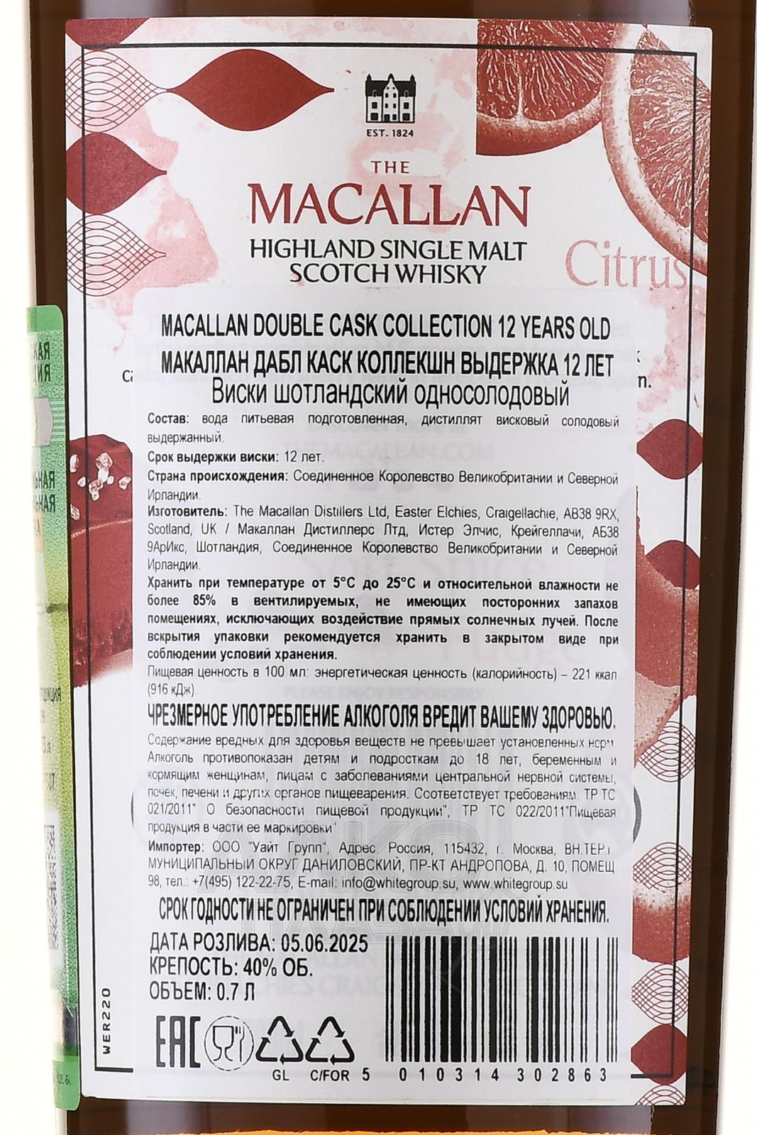 Виски Macallan 12 years Double Cask 0,7 л в п/у обладает классическим вкусом односолодового выдержанного скотча, мягкую сладость которому придает двойная финишная отделка. Спирты выдерживаются в дубовых бочках из американского и европейского дуба, ранее использовавшихся для хранения хереса. После 12-летней выдержки дистилляты смешиваются в определенных пропорциях, купаж проходит холодную фильтрацию и бутилируется. Виски в сувенирном оформлении послужит статусным подарком для ценителей.