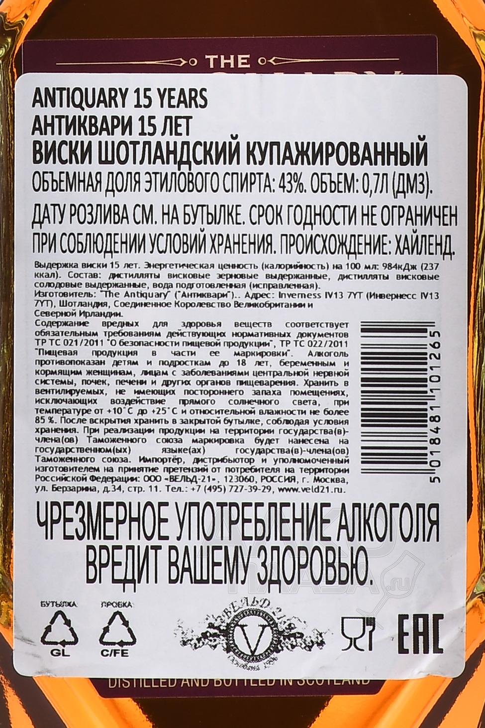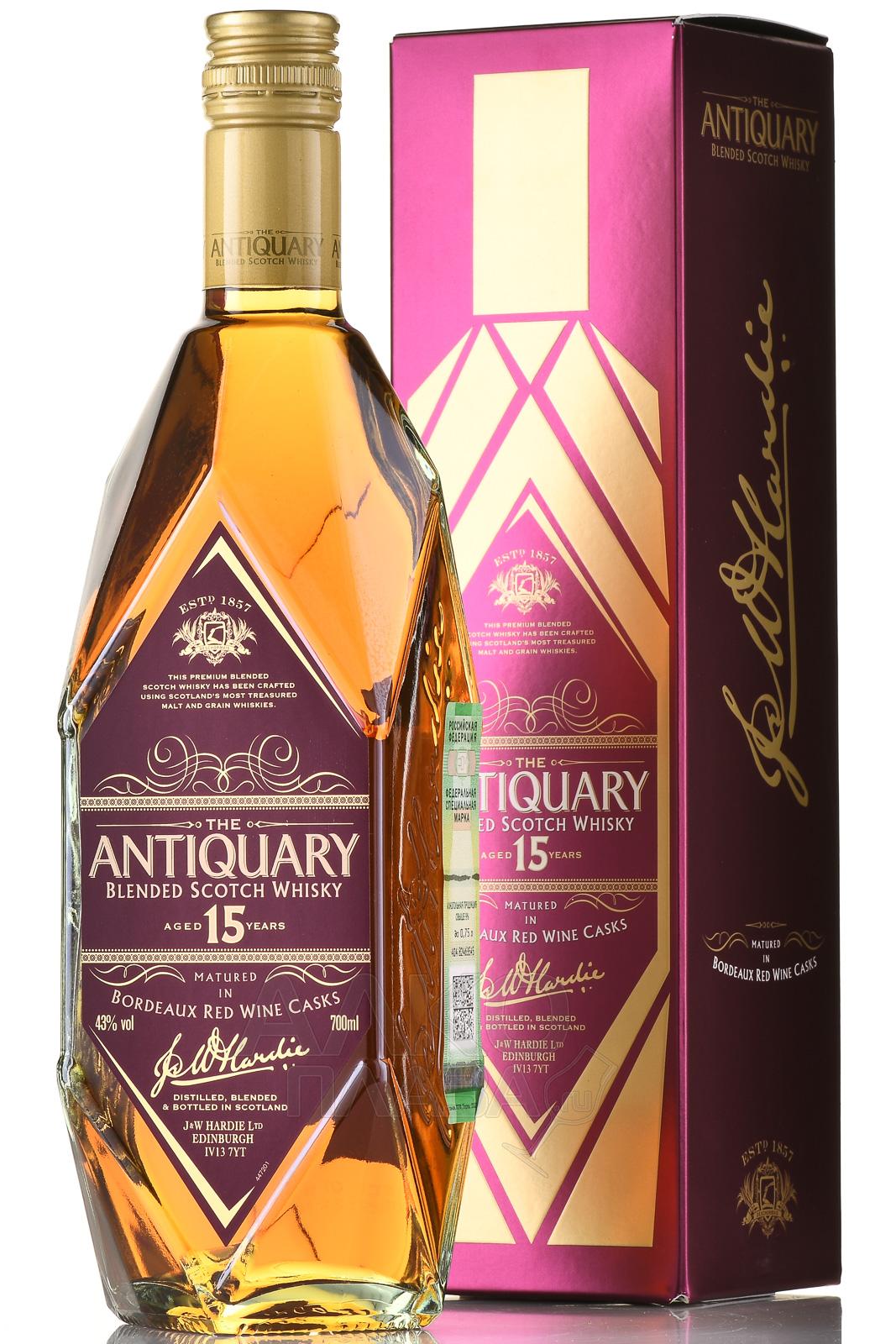 Виски купажированный Antiquary 15 лет 0,7 л в п/у — подходящий подарок для ценителя, кто хочет открыть для себя нечто новое и необычное. Премиальный бленд в стильном подарочном оформлении создан из лучших солодовых спиртов регионов Спейсайд и Хайленд в сочетании с зерновыми дистиллятами из Лоуленда. Выдержка в течение 15 лет проходила в традиционных дубовых бочках, завершаясь дозреванием в бочках из-под красного вина Бордо. Благодаря этой особенности виски приобретает характерный, сложный и выразительный вкус. Его стиль — классический и одновременно современный, со своими индивидуальными чертами. Бутылка с оригинальным дизайном акцентирует внимание на антикварной и коллекционной концепции бренда.