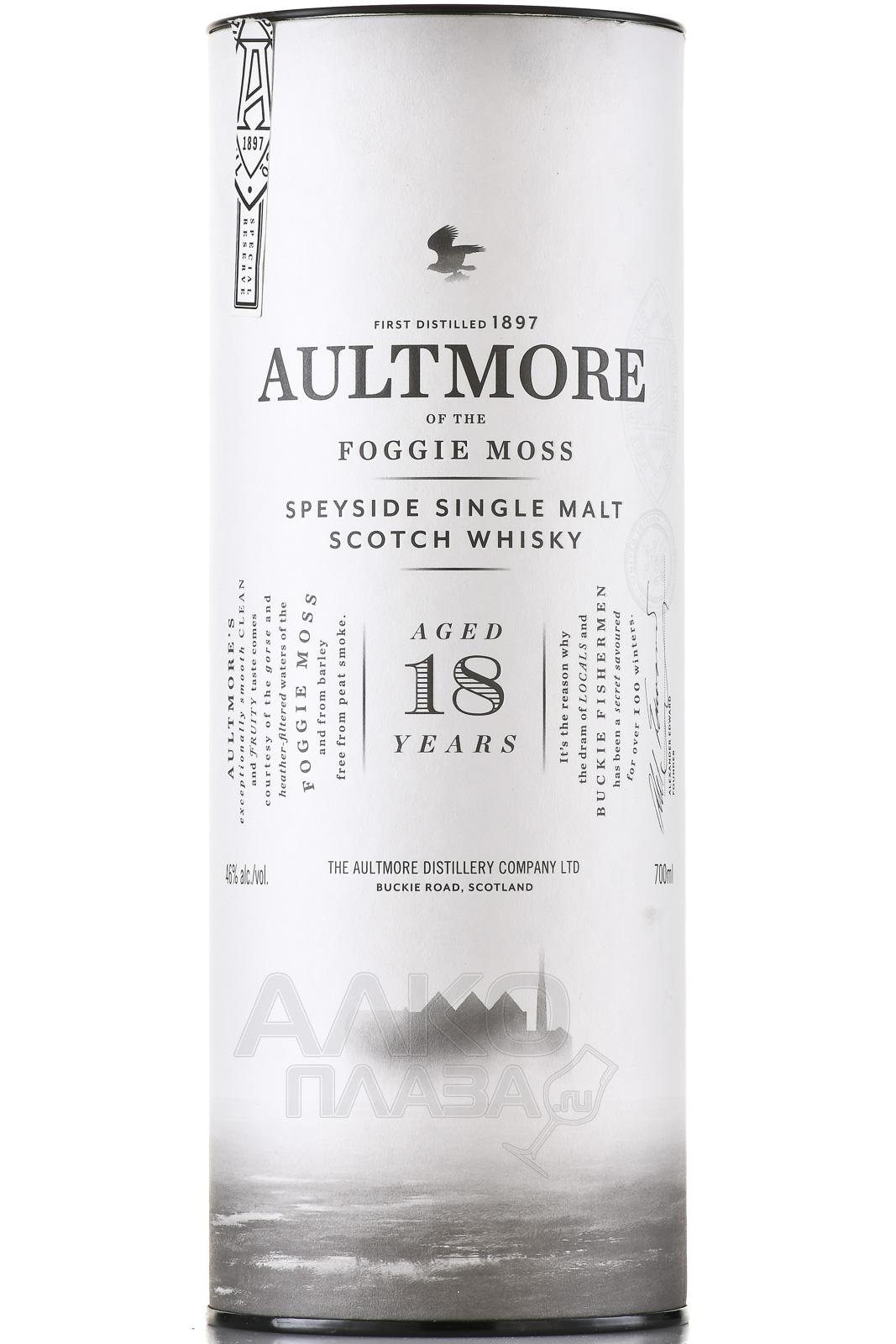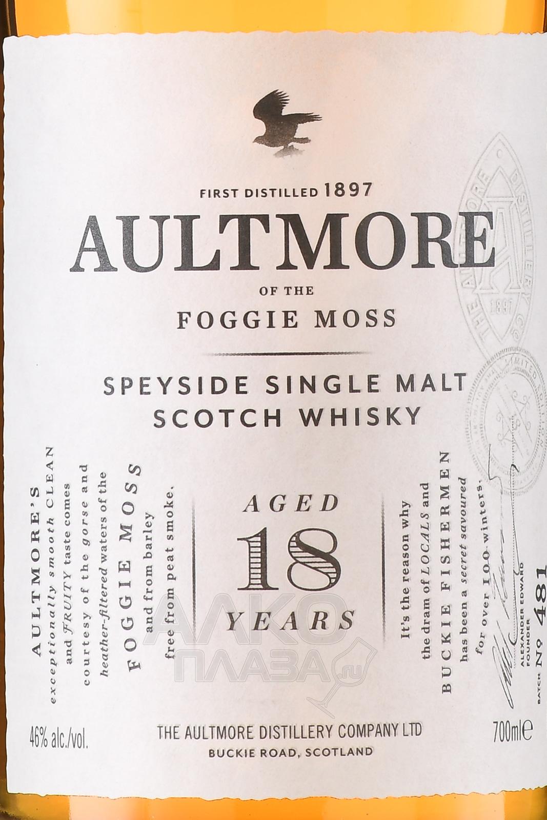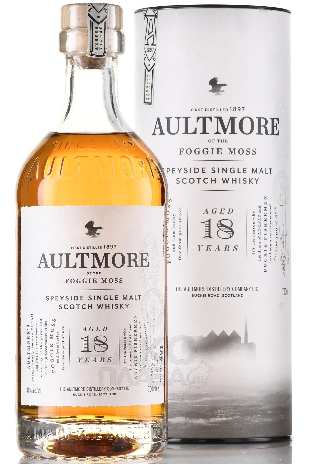 Aultmore 18 years (Олтмор 18 лет ) - это уникальный виски из региона Спейсайд, благородный, с богатым, сбалансированным и многогранным вкусом. Цвет у напитка ярко-золотой. В нем прослеживаются оттенки трав и шалфея, вербены, абрикоса, корицы и черного перца. Вкус виски динамичный и хорошо сбалансированный. В послевкусии прослеживаются нотки засахаренных фруктов.