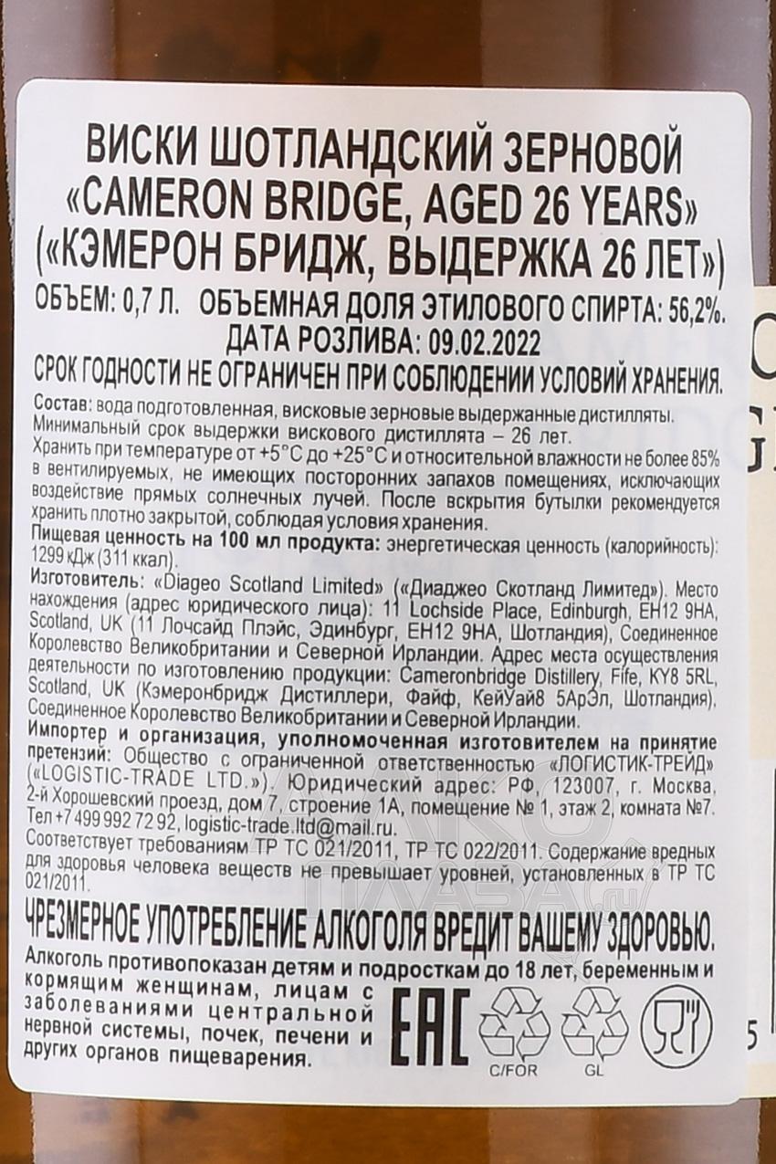Виски Cameron Bridge 26 Year Old 0.7 л был создан на легендарной шотландской винокурне, известной старинной технологией непрерывной перегонки. В процессе производства мастера использовали медные колонны, что позволило добиться чистоты и особой мягкости напитка. Скотч выдерживался 26 лет в тщательно отобранных дубовых бочках (новых и повторного наполнения), что придало ему исключительный характер и изысканные оттенки.