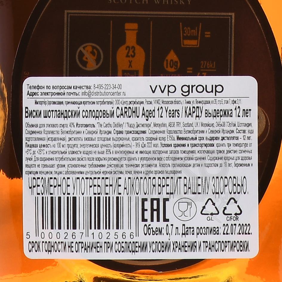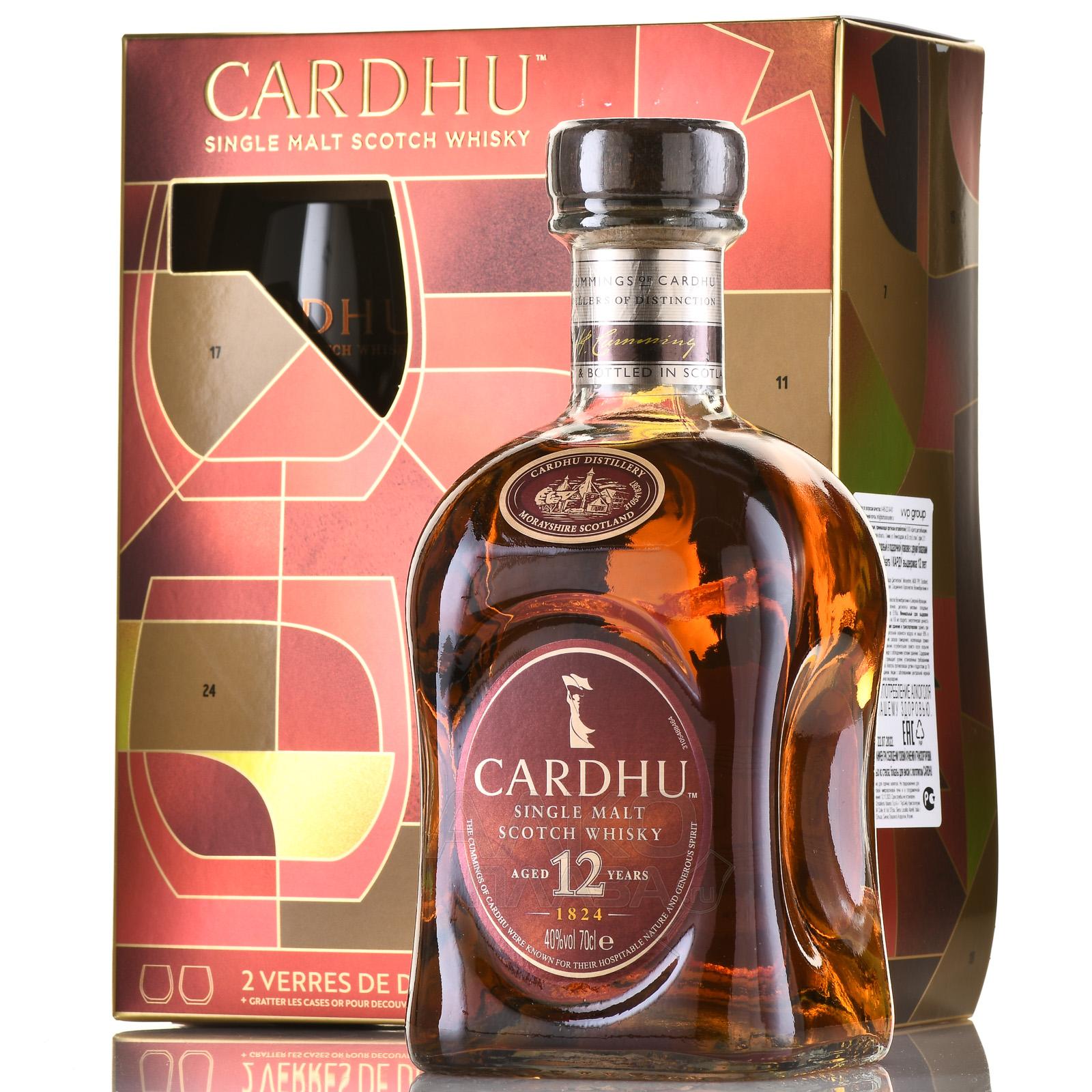 Виски Cardhu 12 лет 0,7 л в п/у + 2 бокала — это стильный подарочный набор, который будет уместен в качестве презента по какому-либо значимому поводу. В сувенирном оформлении представлен классический сингл молт из региона Спейсайд, который отличается мягким, сбалансированным вкусом с фруктово-медовыми и дымными нотами. Он произведен дистиллерией Карду, основанной в 1824 году. Виски выдерживается 12 лет в отборных дубовых бочках, что придало ему характерную глубину и округлость. 12-летняя версия входит в линейку Classic Malts от Diageo и является обладателем престижных золотых и серебряных наград конкурса International Wine and Spirit Competition.