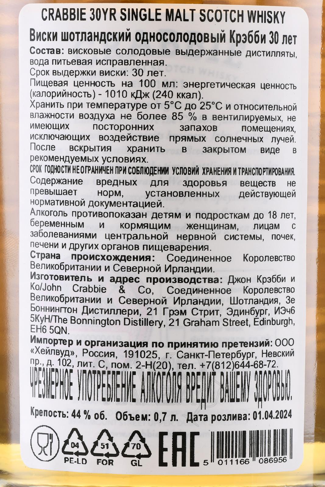 Crabbie 30 Year Old - виски Крэбби 30 лет 0.7 л в д/у