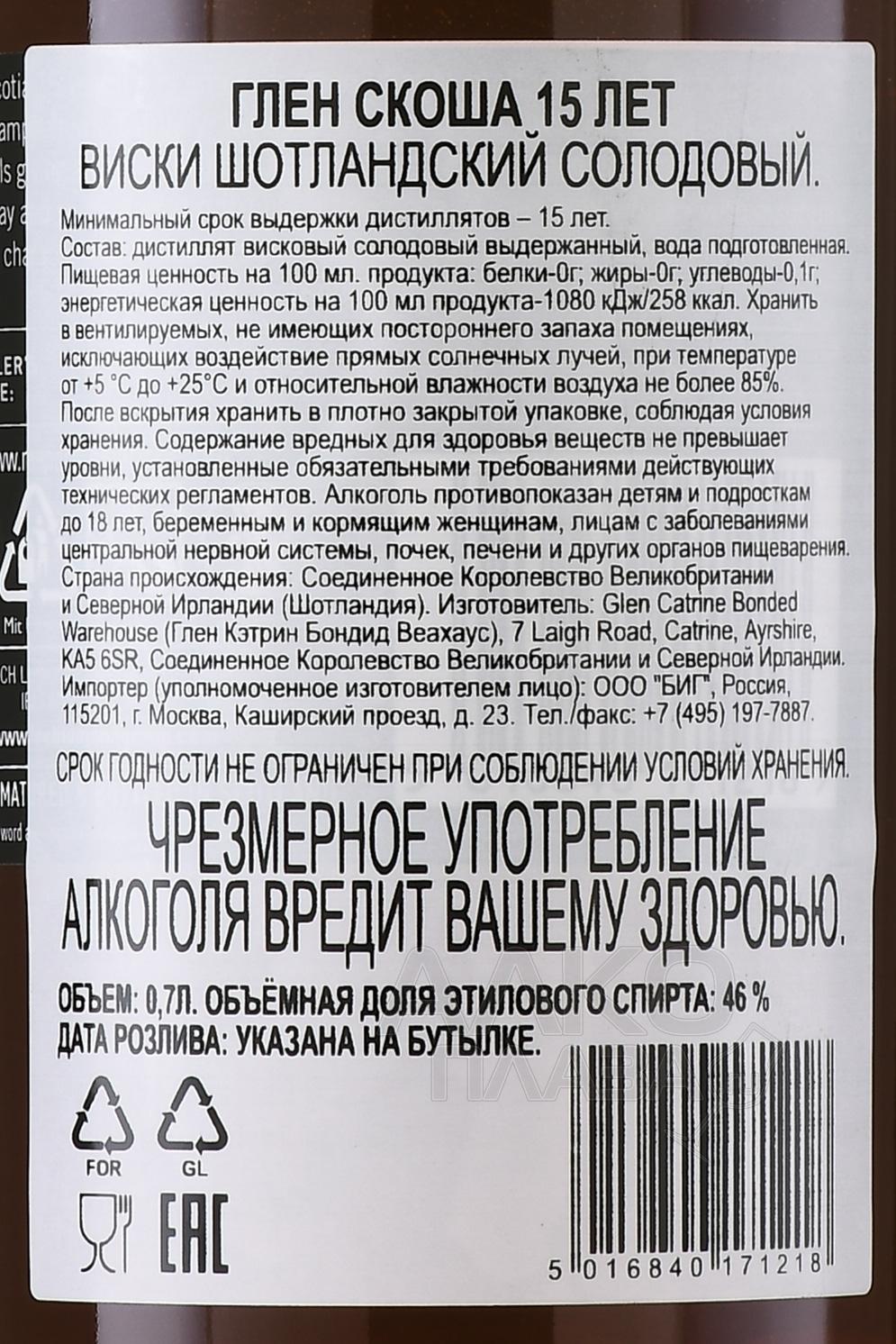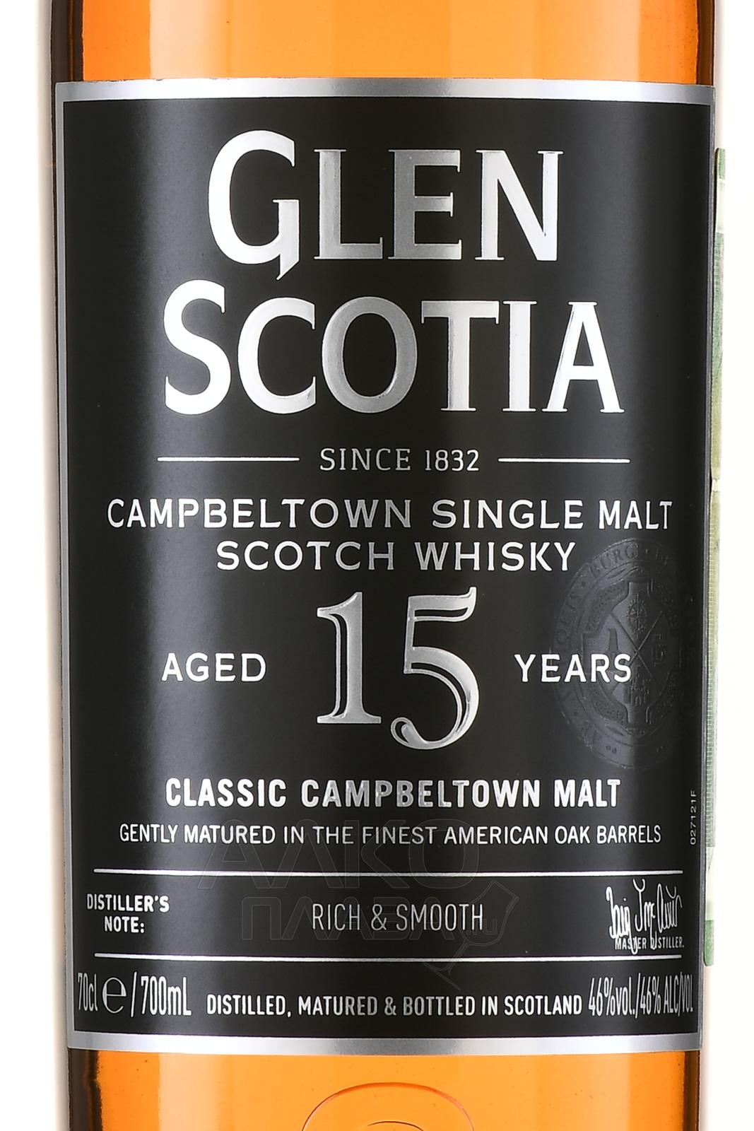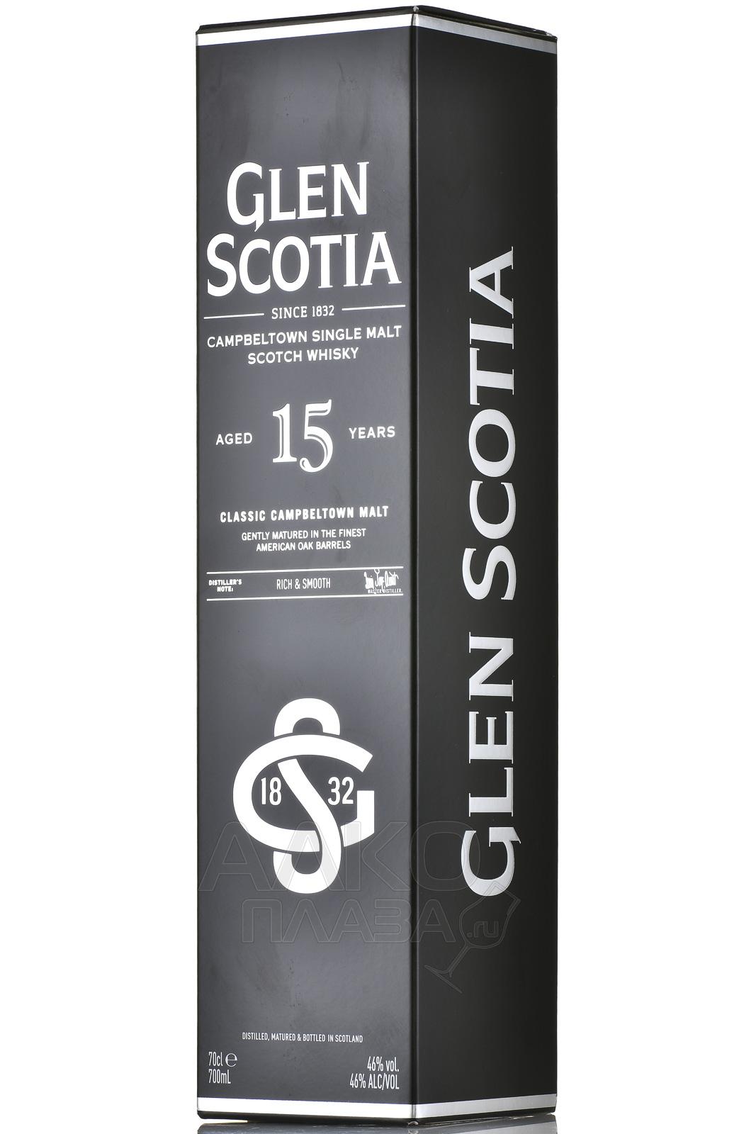 Glen Scotia 15 Years Old ( Глен Скотиа 15 лет ) - добротный виски с необыкновенной ароматикой дыни, абрикосов и манго. Во вкусе цитрусовая свежесть переплетается с карамельной сливочностью и завершается долгим фруктовым послевкусием.