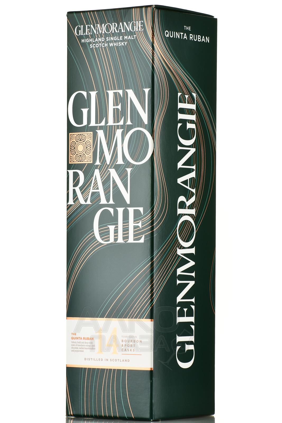 Glenmorangie Quinta Ruban 12 years ( Гленморанджи Кинта Рубан 14 лет ) - глубокий рубиновый оттенок этого виски достигается путем выдержки в бочках из-под портвейна. Аромат яркий, в нем и мармелад, и свежие спелые ягоды с кислинкой. Вкус раскрывается притягательной сладостью инжира в шоколаде, фиников и пикантной горчинкой.