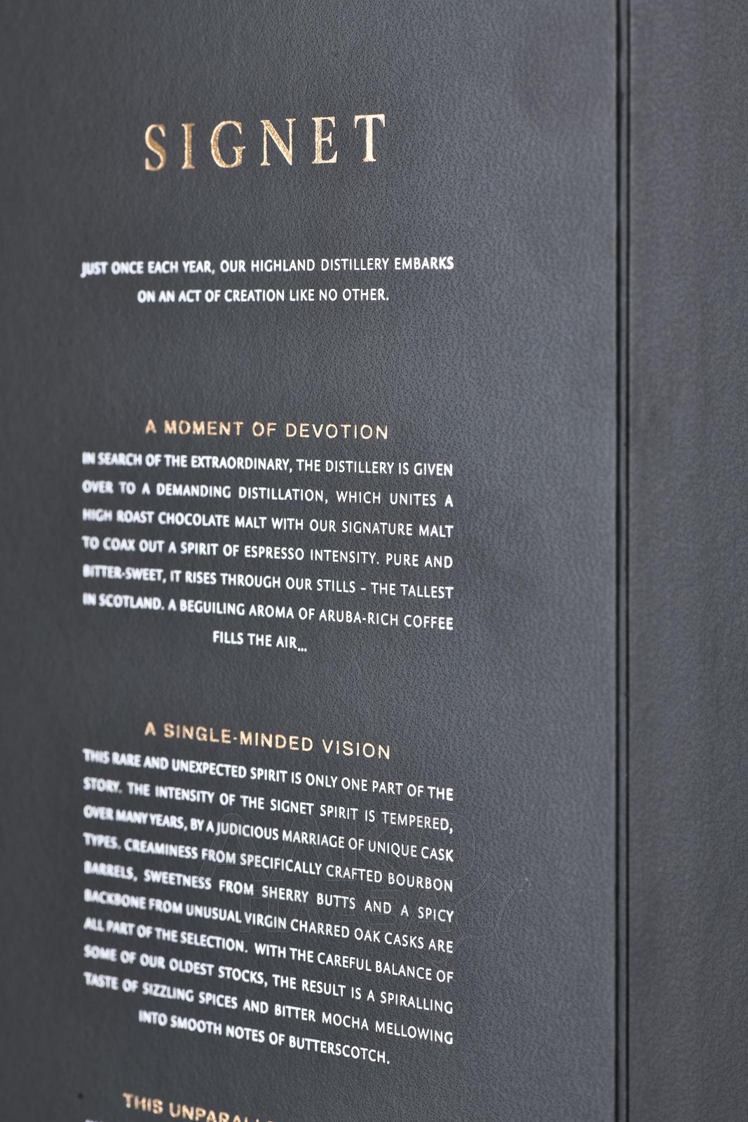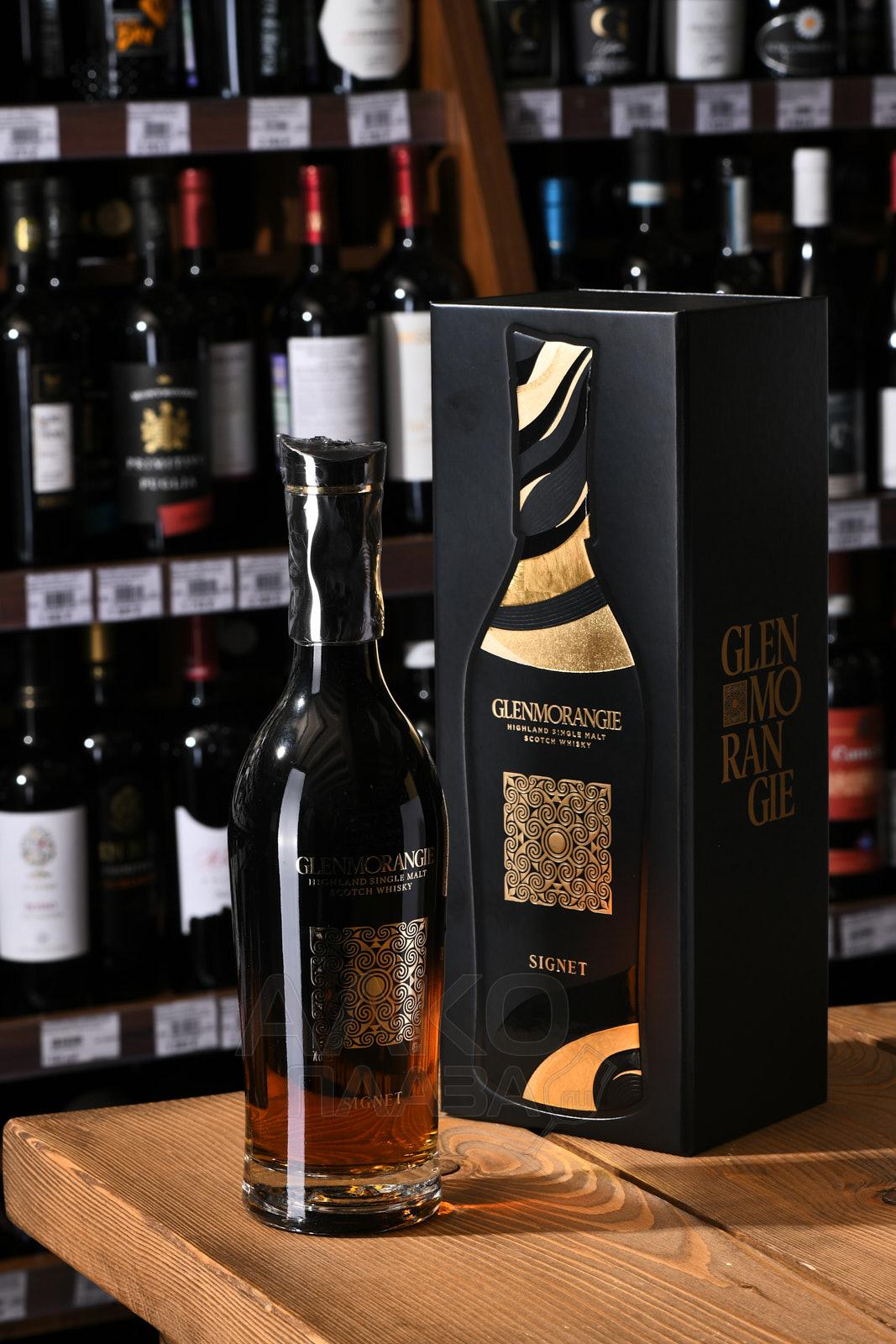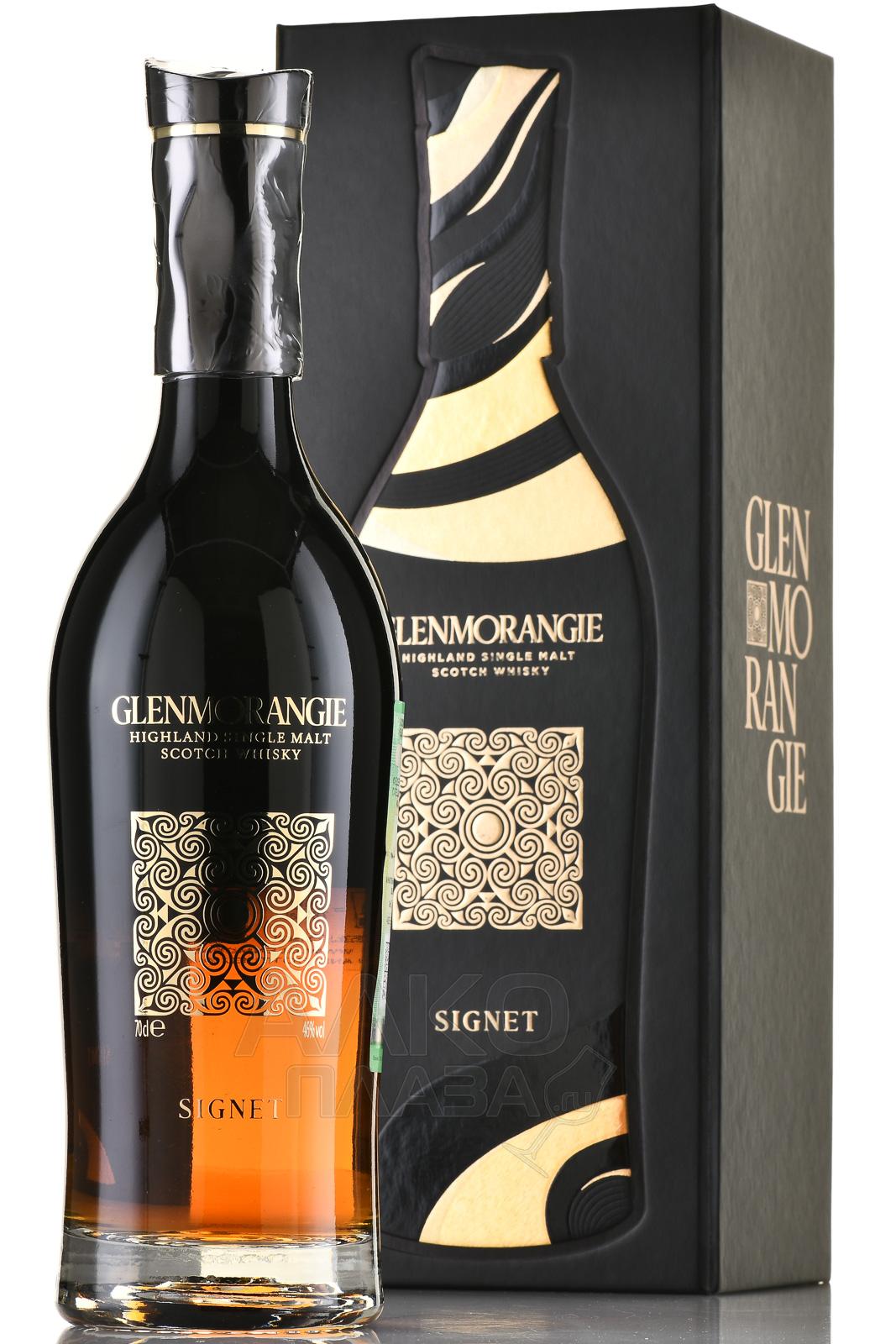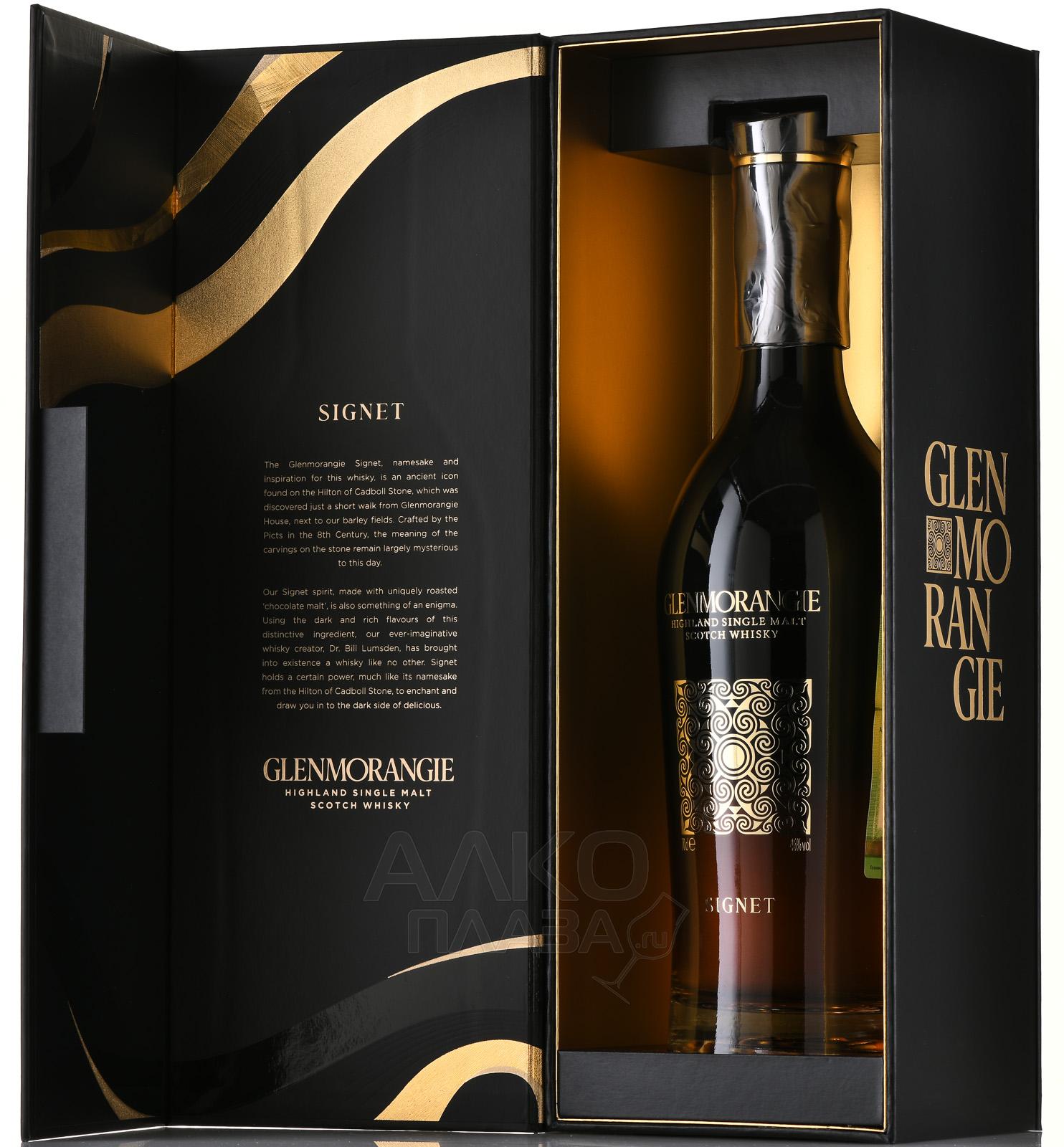 Glenmorangie Signet ( Гленморанджи Сигнет ) - этот виски, цвета смолы, потрясает разнообразием ароматов. Тут и карамель, и цветы вперемешку с абрикосовым джемом. Вкус горького шоколада, какао, табака и мюсли еще долго будут согревать вас теплым медовым послевкусием.