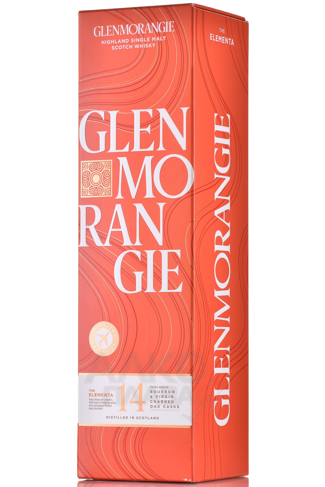 Виски Glenmorangie The Elementa 1 л в подарочной упаковке из картона оранжевого цвета, содержащей бутылку чуть больше стандартного объема, был выпущен шотландской дистиллерией из региона Хайленд при уровне крепости 43 градуса. Возраст скотча односолодового формата составляет не менее 14 лет — именно такой срок спирты соложеного ячменя, образующие основу напитка, провели в дубовых бочонках (новых и повторного наполнения — из-под бурбона). Холодная фильтрация перед бутилированием не осуществлялась.