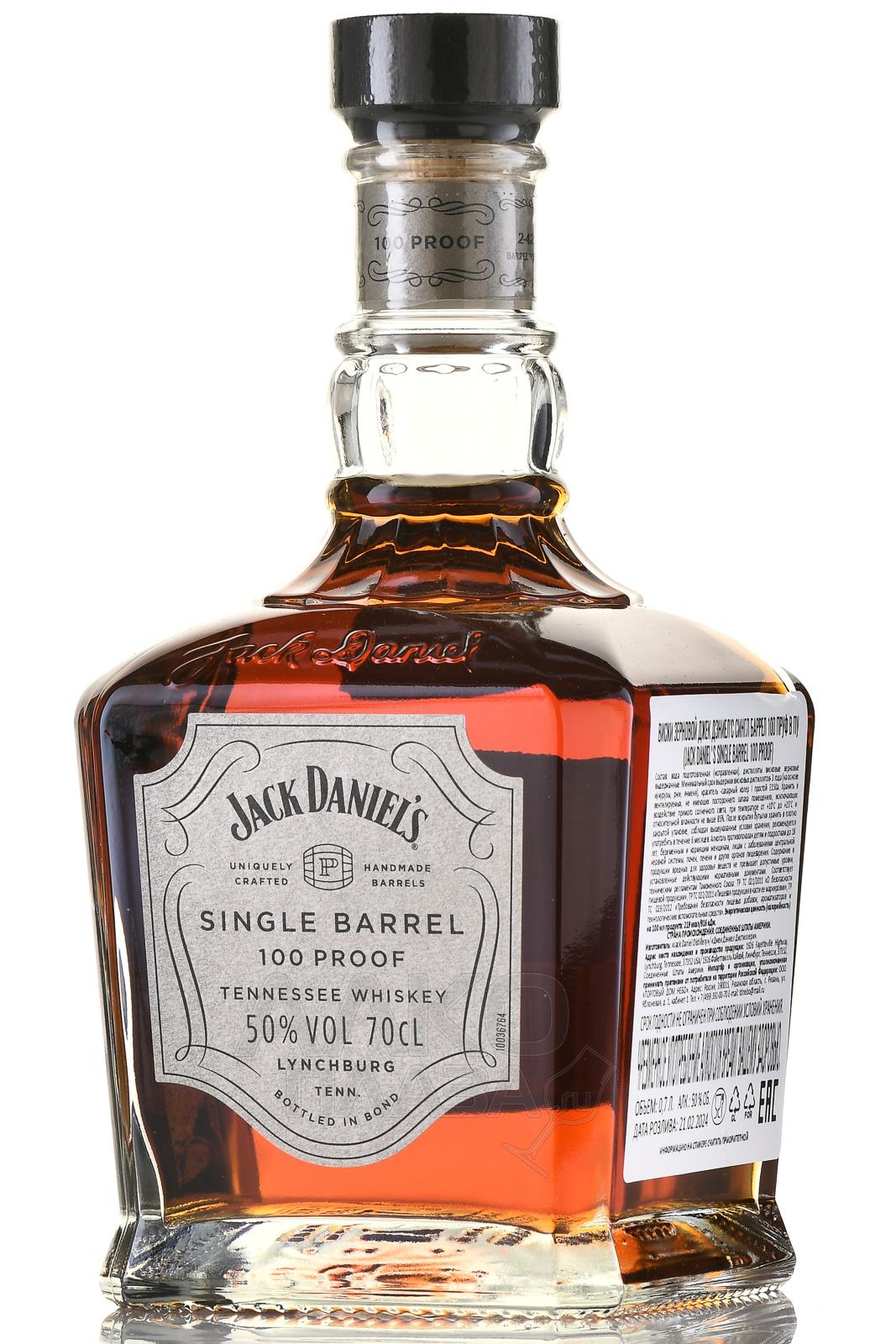 Виски Jack Daniel`s Single Barrel 100 Proof 0,7 л в п/у представляет собой лимитированное издание с более высокой, чем у стандартных напитков этой категории, крепостью. Каждая бутылка разливается вручную из одной бочки, благодаря чему демонстрирует уникальный характер. Производство осуществляется в Линчбурге, в штате Теннесси, с использованием классического рецепта бренда, включающего 80% кукурузы, 12% ржи и 8% соложеного ячменя. Перед выдержкой спирт проходит через 3-метровый слой древесного угля из сахарного клена, обеспечивающего характерный мягкий вкус. Созревает дистиллят на верхних ярусах складов, где колебания температуры способствуют более интенсивному взаимодействию с древесиной бочки. При бутилировании крепость спиртного составляет 50%, что соответствует американскому стандарту 100 proof.
