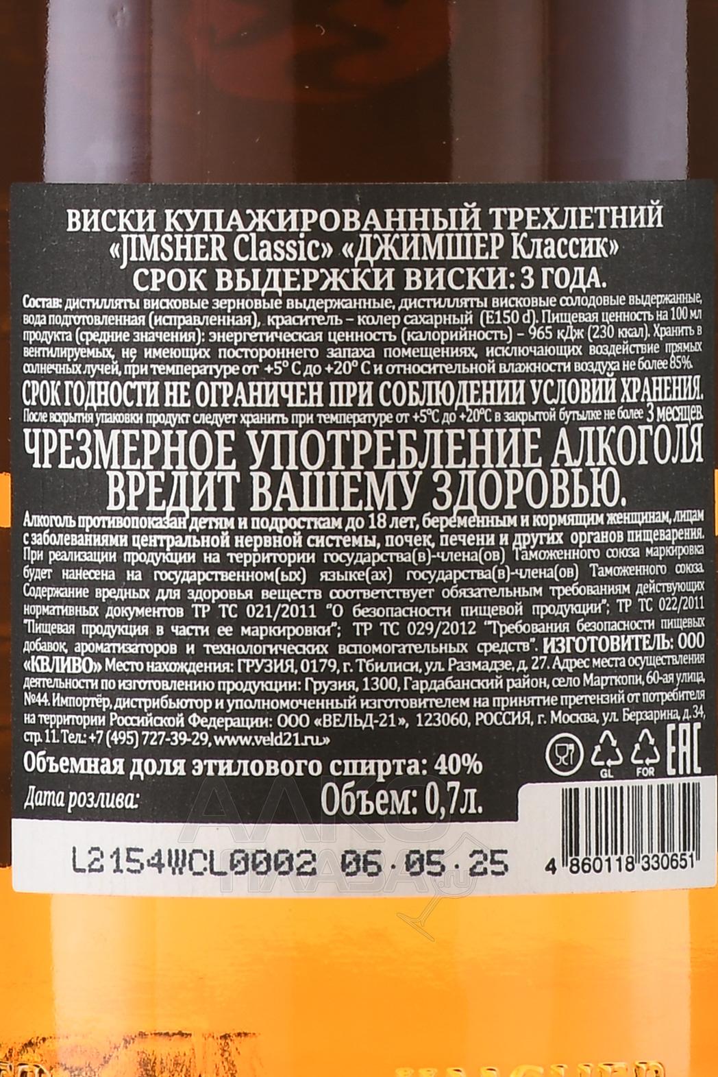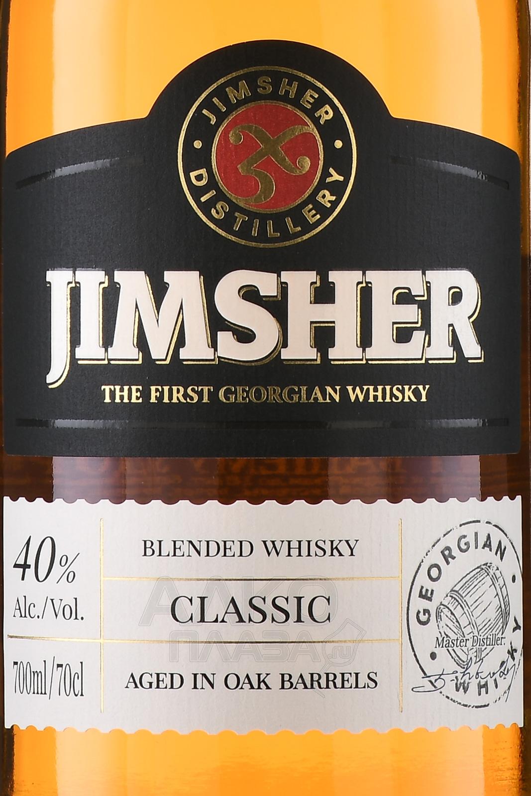 Виски Jimsher Classic 3 года 0,7 л – это первый грузинский классический whisky с выдержкой не менее трёх лет. Крепость его составляет 40%. Он производится методом купажирования спиртов, полученных из соложеного ячменя и непророщенного зерна. После двойной перегонки дистилляты выдерживаются в дубовых бочках, которые ранее использовались для американского бурбона. Климат Грузии с жарким летом и умеренно холодной зимой способствует ускоренному созреванию напитка, усиливая его ароматические свойства и делая вкус более мягким и сбалансированным. В 2017 году Джимшер Классик получил международную награду на конкурсе World Whisky Masters в Лондоне.