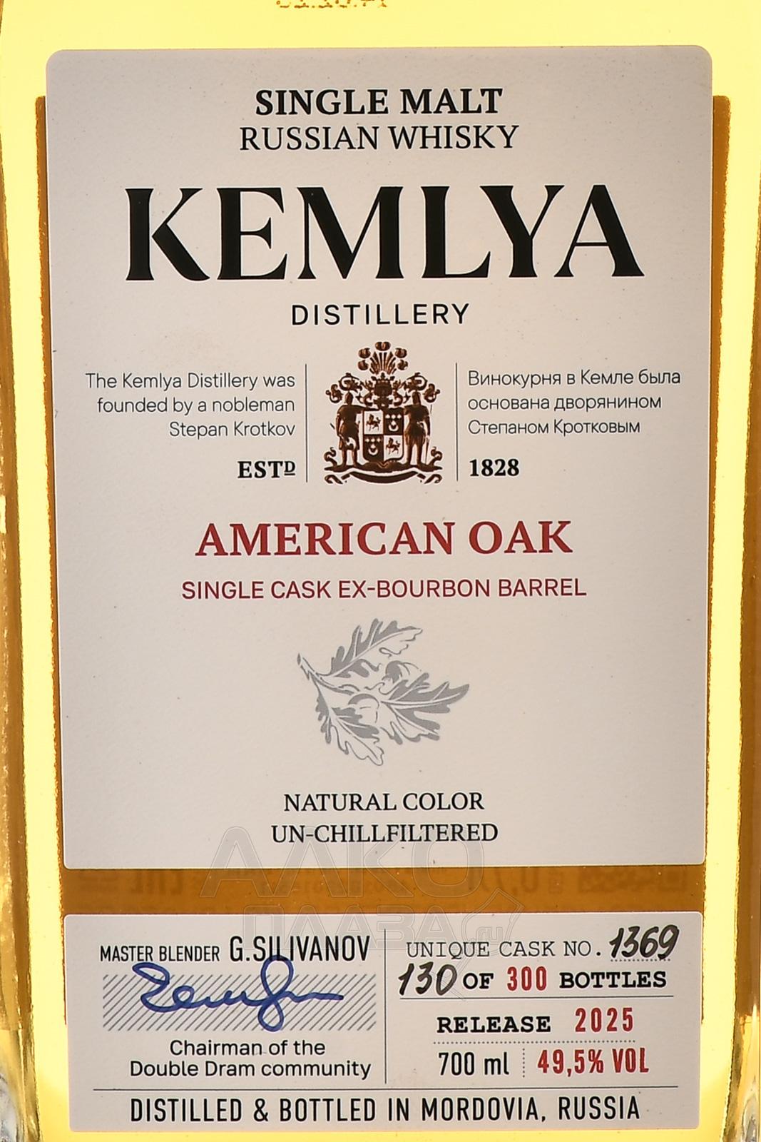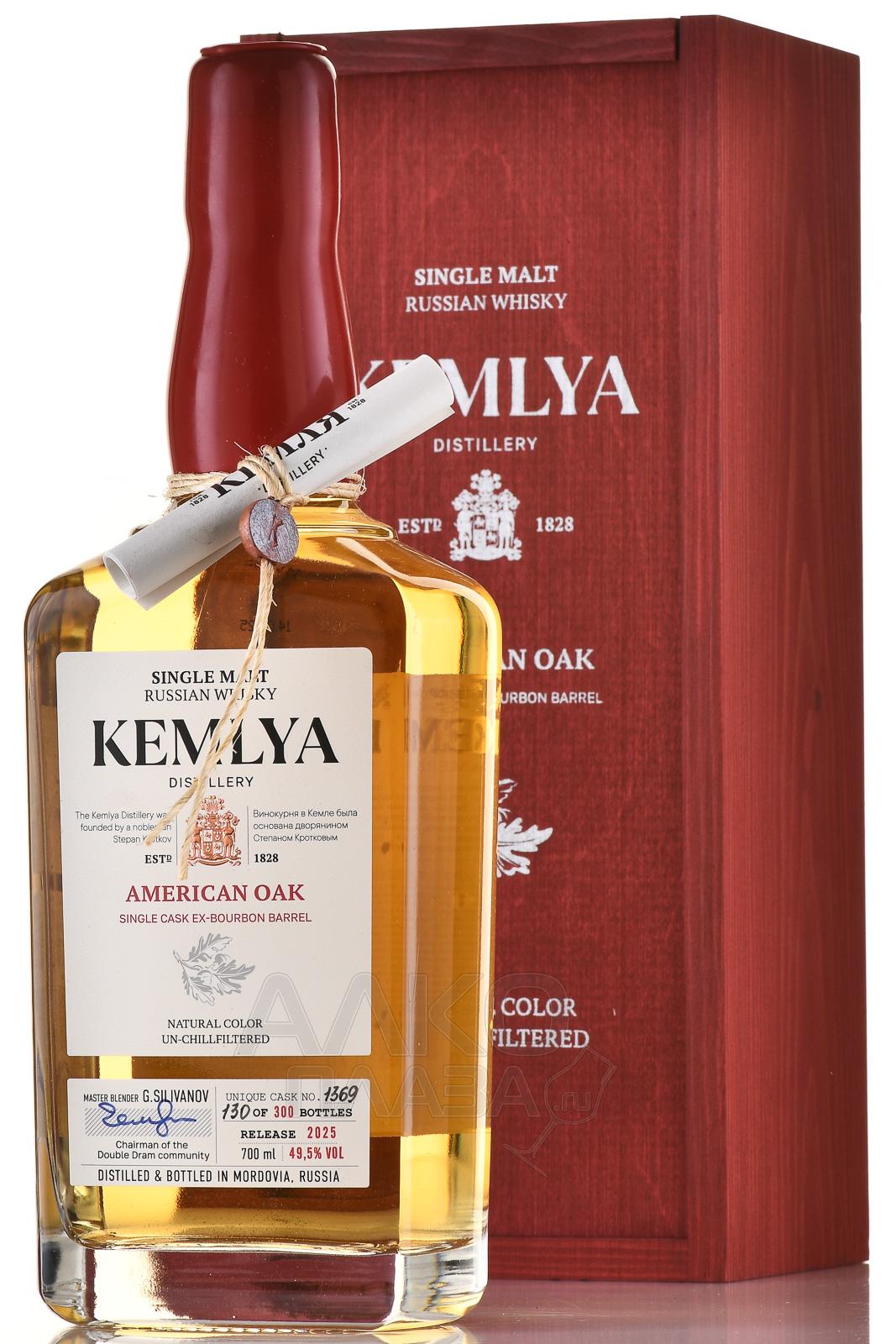 Виски Kemlya American Oak 0,7 л в д/у — это российский односолодовый напиток, произведённый на заводе в селе Кемля в Республике Мордовия. Особенность его заключается в выдержке в течение 4 лет в дубовых бочках из американского белого дуба, ранее служивших для хранения бурбона. Перед использованием ёмкости проходят интенсивный обжиг, что придаёт дистиллятам выразительный характер и глубину вкуса. Релиз относится к крафтовым спиртным напиткам отечественного происхождения, производимым небольшими партиями с особым вниманием к деталям.