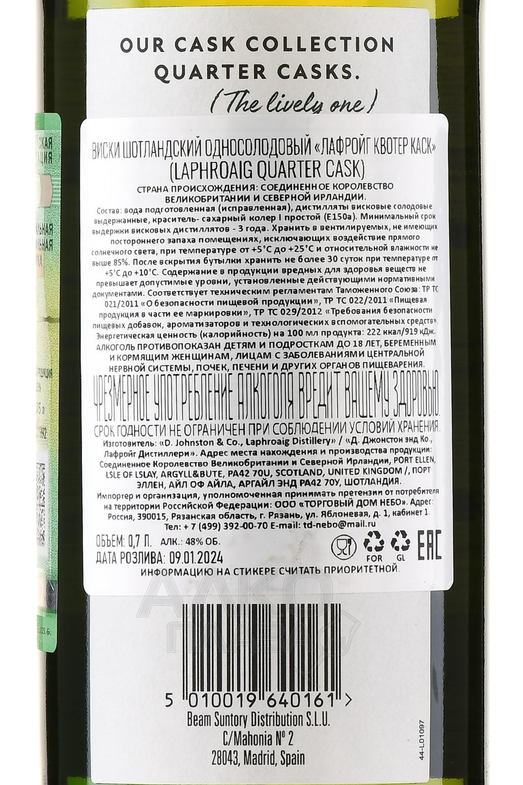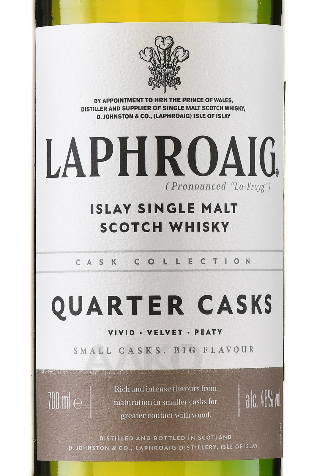 Laphroaig Quarter Cask ( Лафройг Квотер Каск ) - виски чистого соломенного цвета с тонкими торфяными нотами, пронизанными нюансами бинтов, пропитанных йодом, все для истинный почитателей островного виски. Во вкусе пробиваются ноты чернослива, орехов, клюквы и калины. Послевкусие древесное, слегка копченое и согревающее.