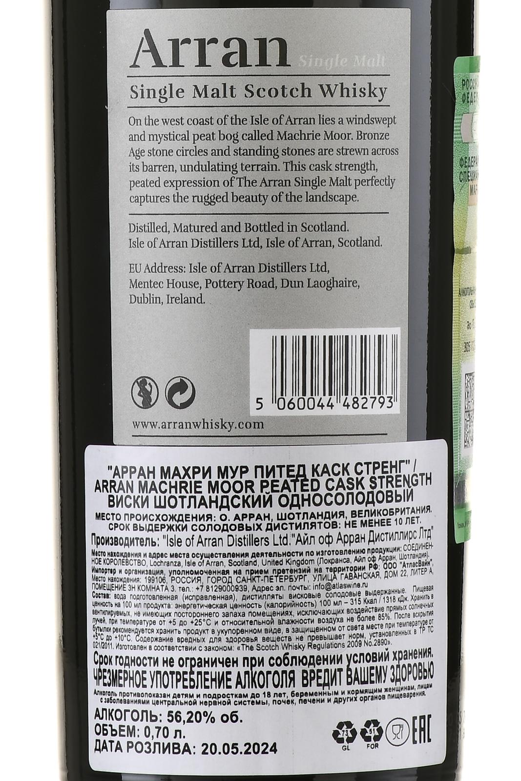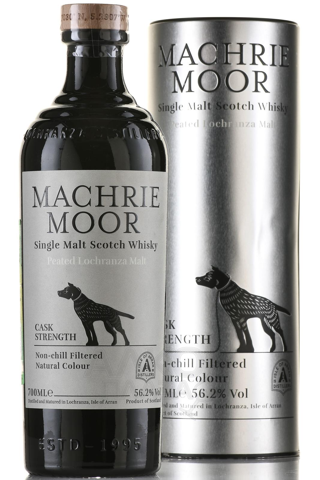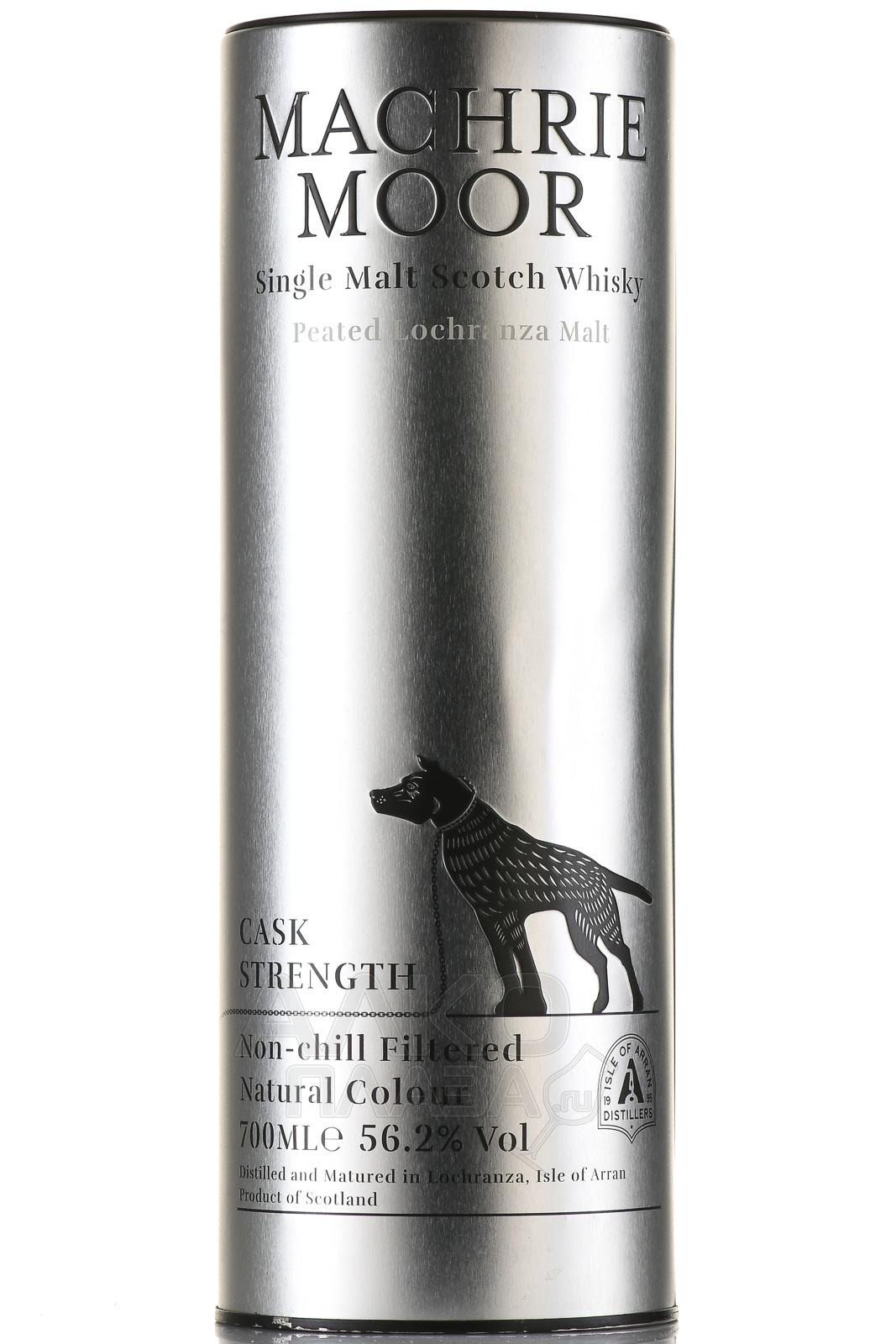 Виски Arran Machrie Moor Cask Strengt 0,7 л в подарочной тубе серебристого цвета с изображением собаки — первоклассный шотландский напиток, относящийся к типу Single Malt. Продукт островной дистиллерии образован ячменными спиртами области Арран с разным сроком нахождения в дубовой таре. Скотч не проходил холодную фильтрацию и окрашивание. На продажу его отправили без разбавления водой, так как розлив осуществился прямо из бочки при естественной крепости 56,2 градуса.