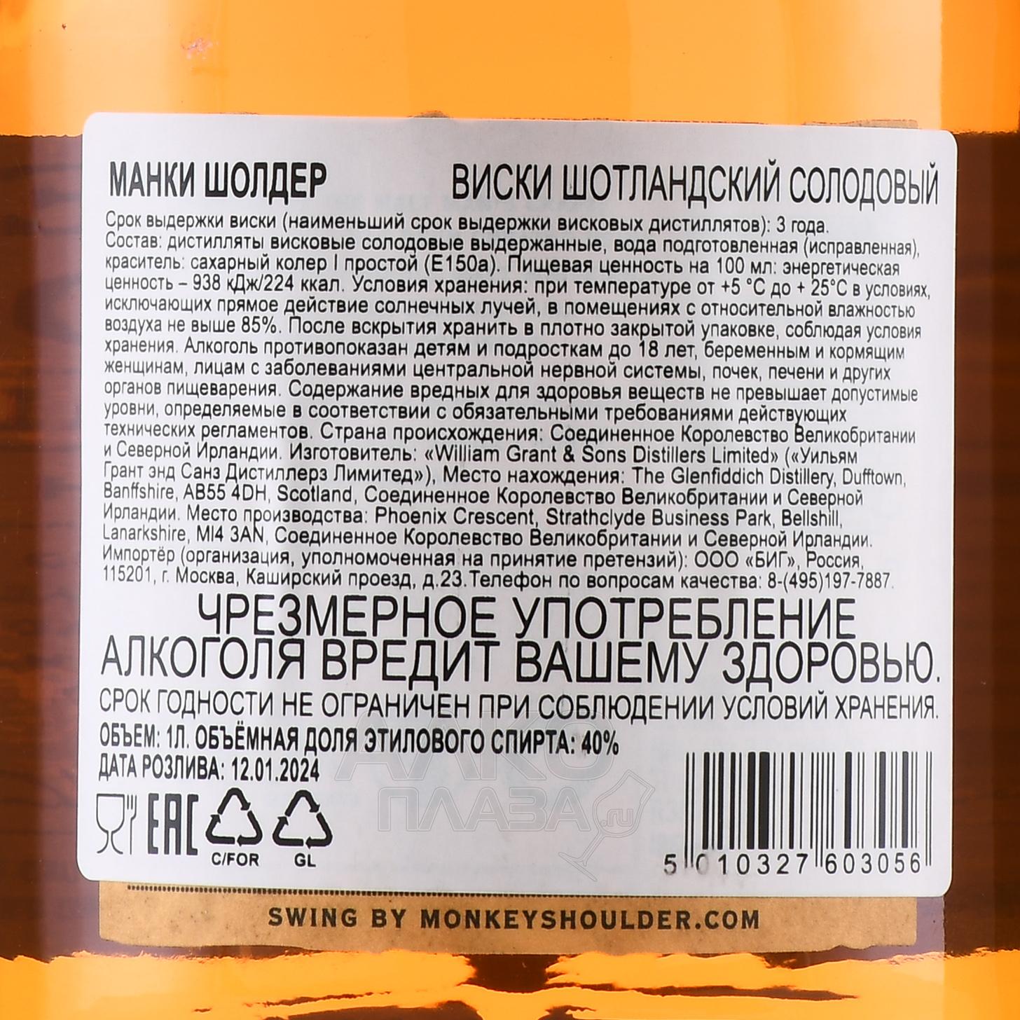 "Monkey Shoulder" вобрал в себя вкусовые оттенки ягод, мёда и ириса. Создатели виски объединили солода с трёх лучших заводов Speyside: Balvenie, Kininvie и Glenfiddich. Выдержка производится в американских бочках из-под бурбона. Бондари компании переделывают поступившие к ним бочки таким образом, чтобы вкусовые качества полученного виски становились всё мягче и нежнее.