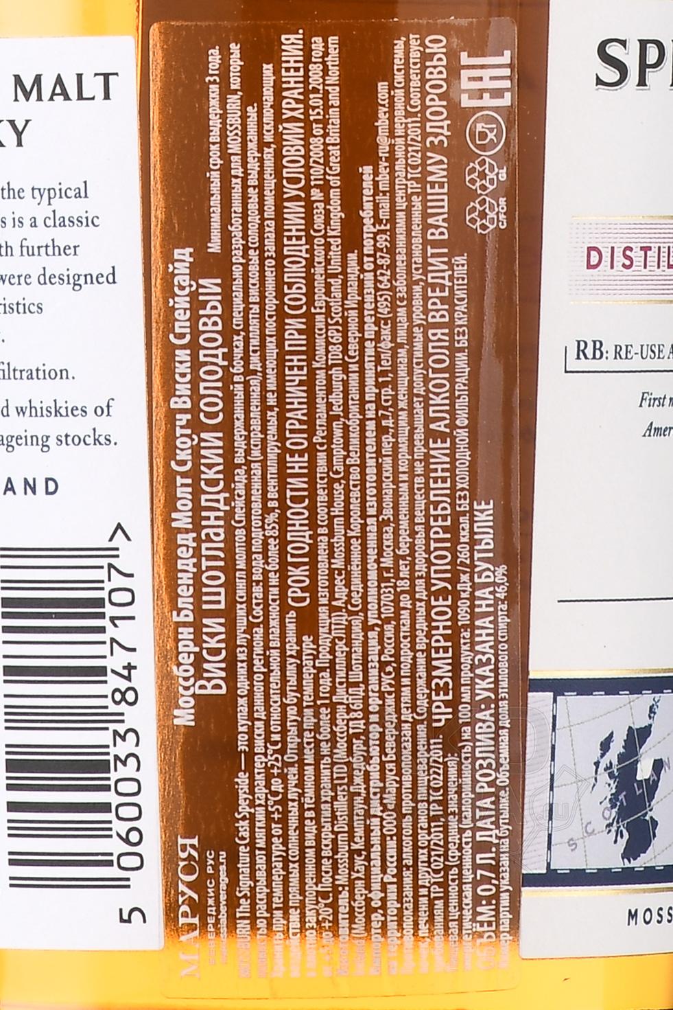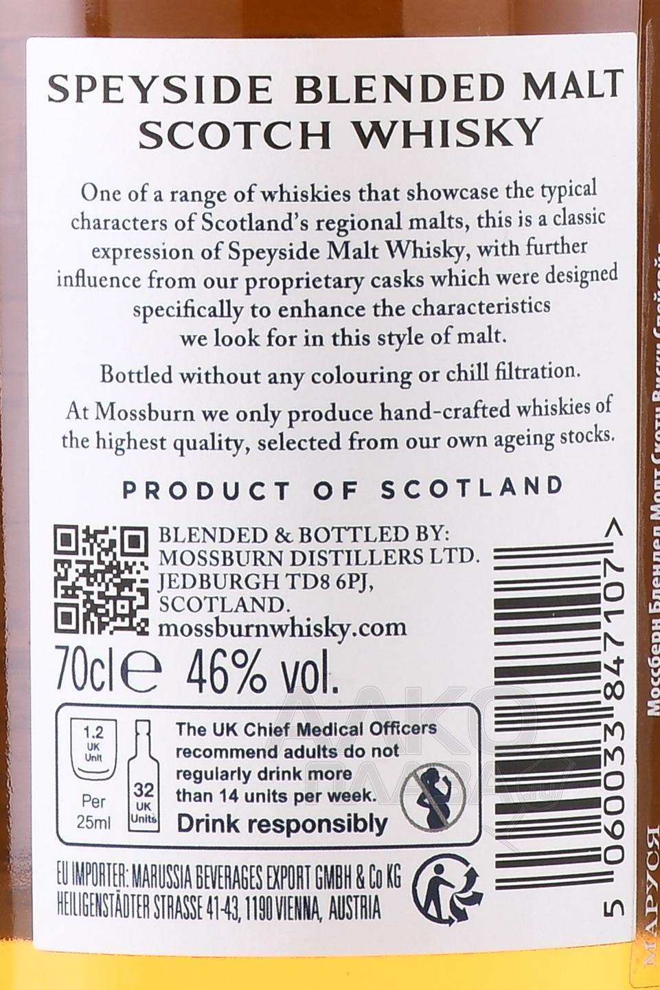 Один из двух первых релизов серии Mossburn Signature Casks, представляющей собой смесь купажированных солодов, исследующих региональные различия шотландского виски. Каждый из них закончен в специальных бочках, предназначенных для того, чтобы подчеркнуть особые выдающиеся вкусы виски каждого региона. Во втором выпуске Моссберн нацелился на Спейсайд, виски изготовлен с помощью бочек первого наполнения хереса Олоросо и сильно обожженных из американского дуба.