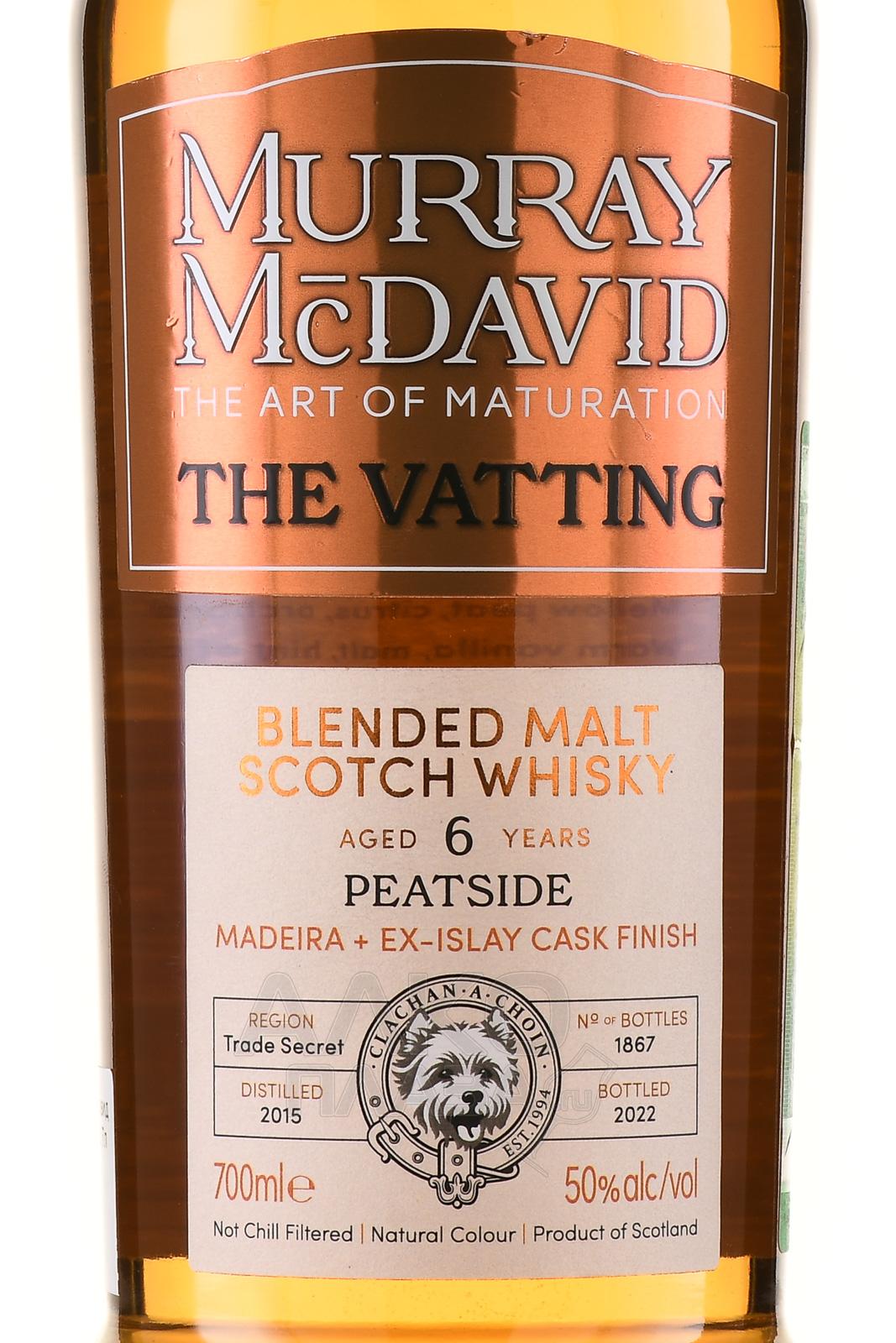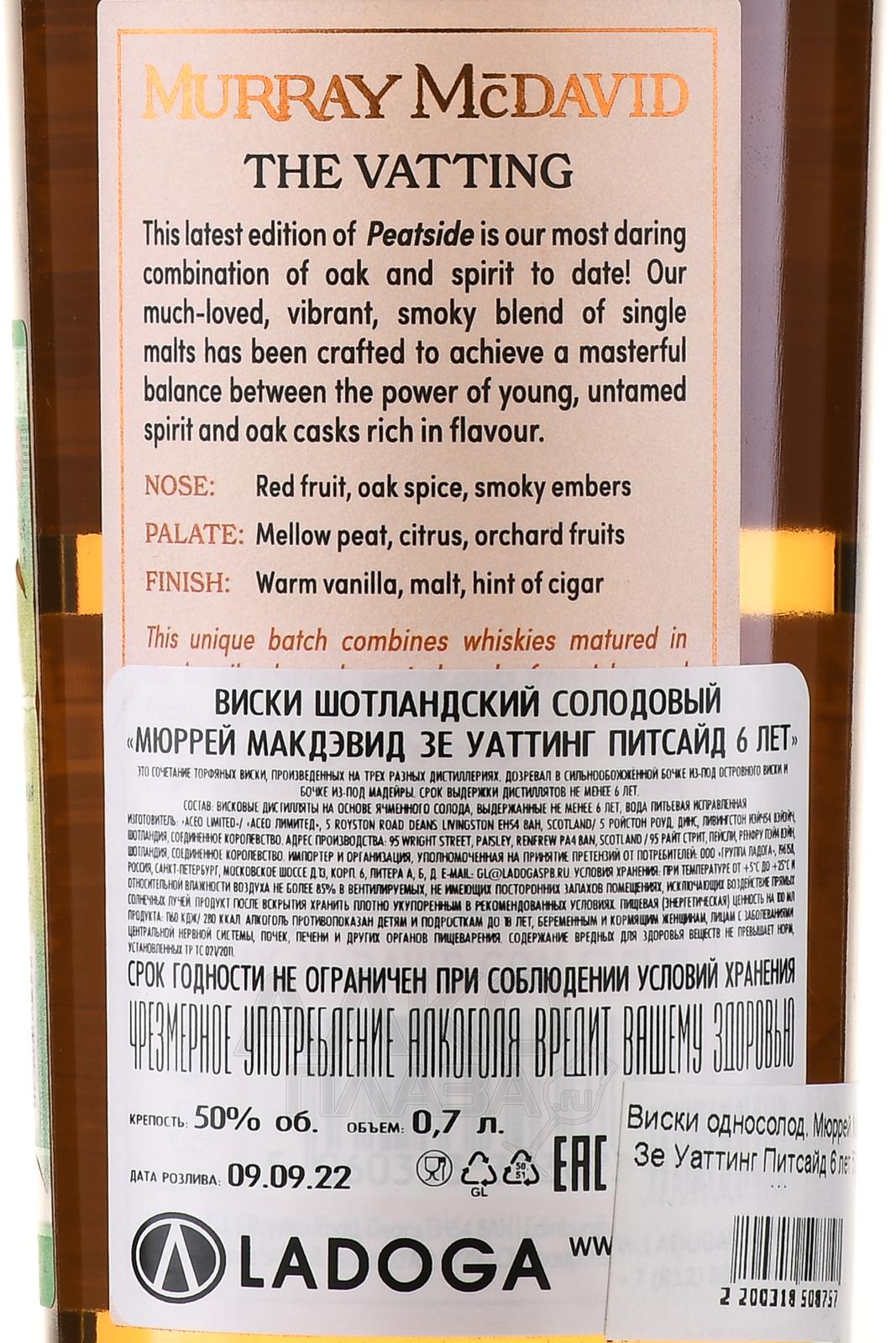 Виски Murray McDavid The Vatting Peatside 6 лет 0,7 л создан в традициях шотландского бленда с ярко выраженным характером островных сортов. Напиток собирается из нескольких солодовых виски, произведённых в регионах с разной стилистикой, что делает его вкус многослойным и динамичным. Особенность технологии – выдержка в сильно обожженных дубовых бочках из-под бурбона и Мадейры Justinos, что придаёт дополнительную глубину. Виски бутилировался без колера и фильтрации. Тираж — 1318 бутылок. Этот скотч получил медали на конкурсах Bartender Spirits Awards и USA Spirits Ratings.