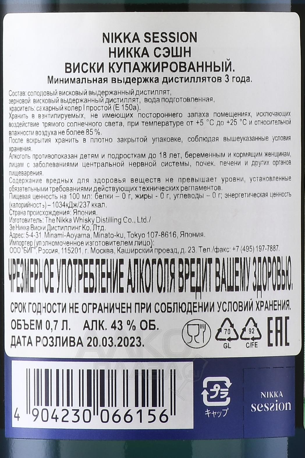 Виски Nikka Session 0,7 л представляет собой современный купаж, созданный мастерами известной японской винокурни. Напиток разработан как blended whisky и объединяет солодовые и зерновые дистилляты японского и шотландского происхождения. Основу составляют спирты, полученные из ячменного солода, перегнанные в медных кубах с различными формами и режимами нагрева. Созревание проходит в дубовых бочках, преимущественно из-под бурбона. Концепция ориентирована на лёгкий, открытый стиль, удобный для повседневного употребления.
