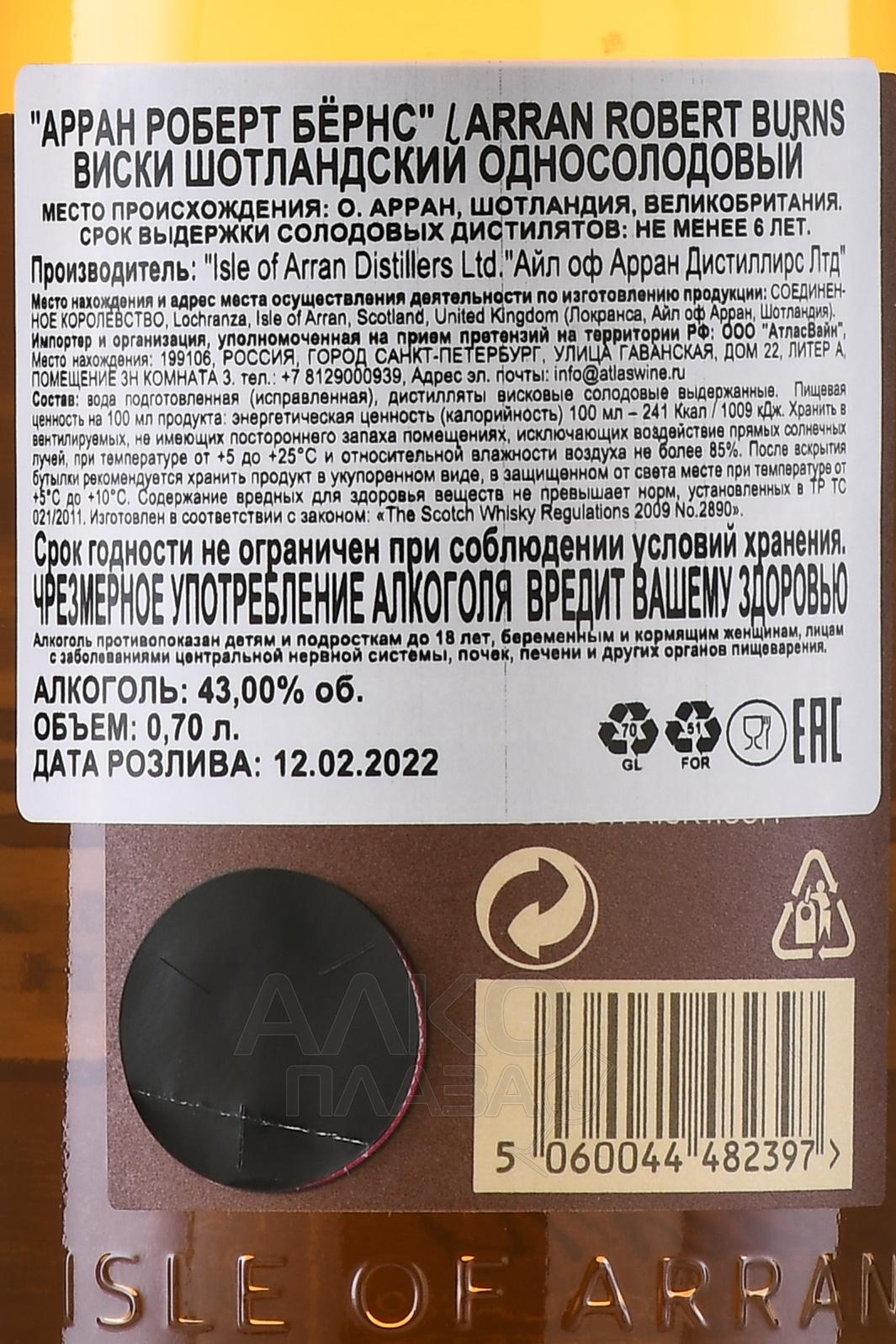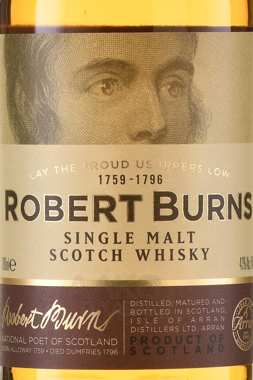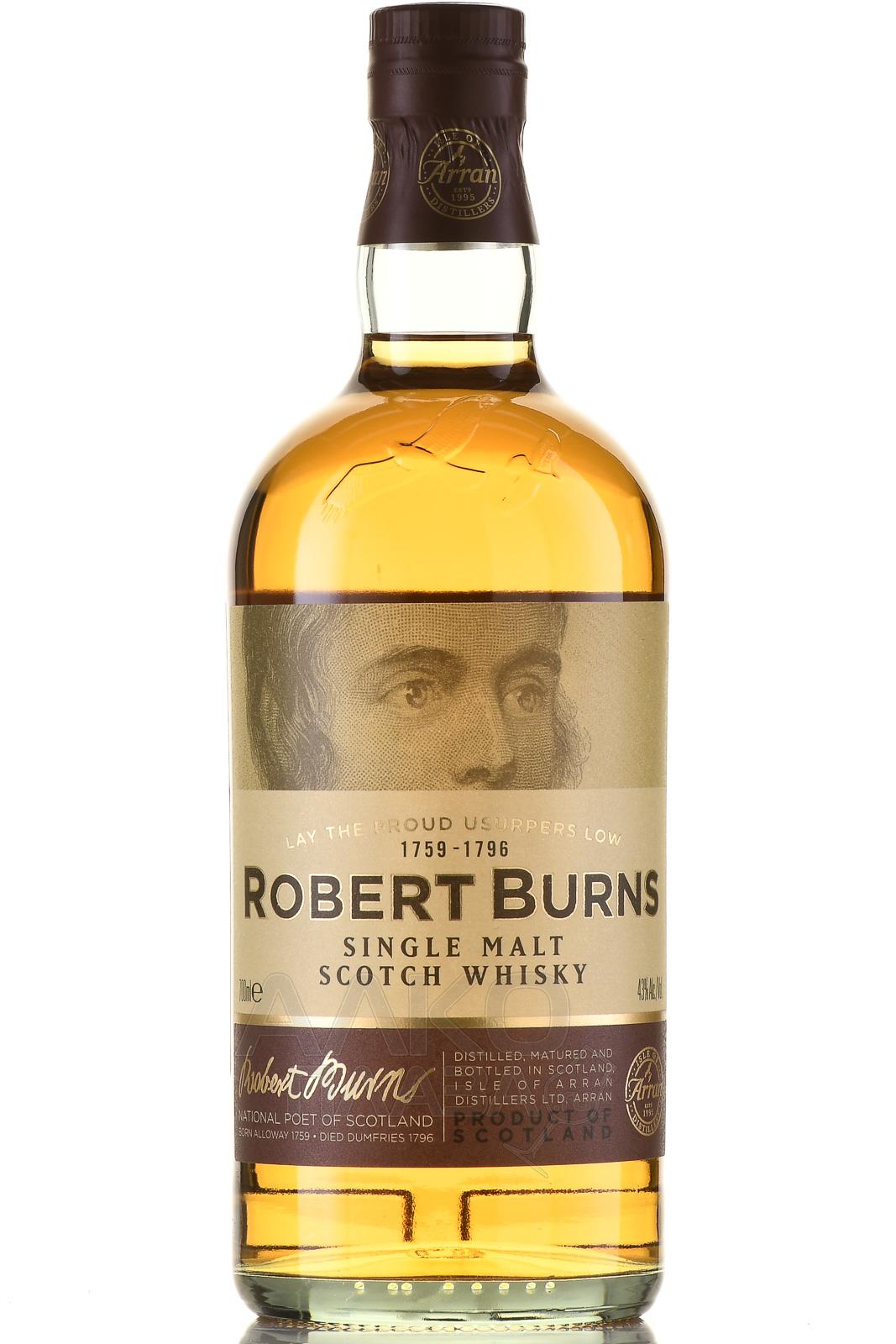 Виски Robert Burns Single Malt 0,7 л создан в честь почитаемого соотечественниками шотландского поэта, воспевавшего родную природу, историю и простых людей. Односолодовая вариация, одобренная Всемирной федерацией Роберта Бернса, изготовлена из ячменя, выращенного в регионе производства – на острове Арран. В состав напитка также вошла вода из горных родников, прошедшая естественную очистку в природе, а затем – на винокурне. Традиционная выдержка в бурбоновых и хересных бочках придала скотчу завершенный характер.