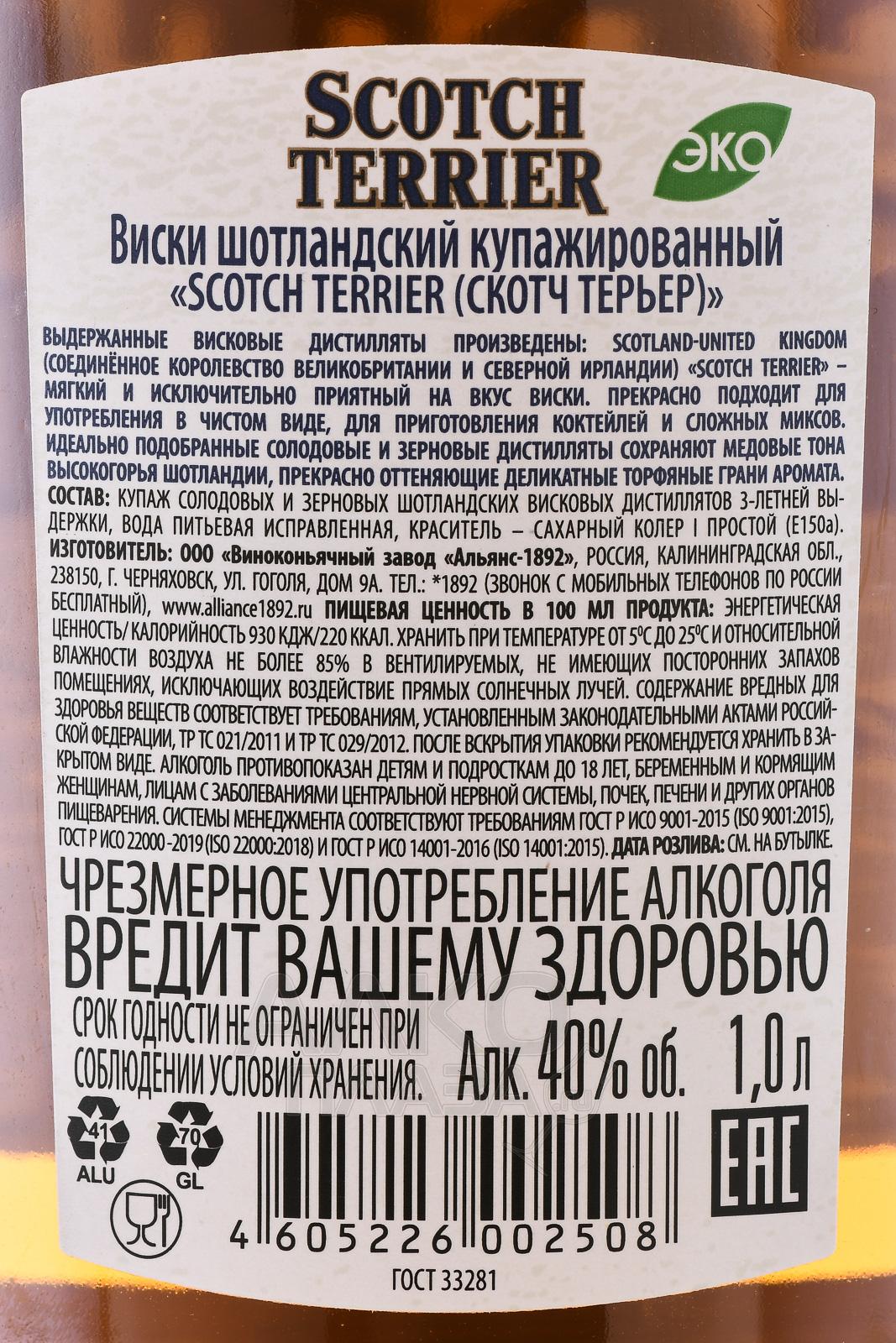 Виски Scottish Terrier 1 л – это купажированный скотч с узнаваемым изображением чёрного скотч-терьера на этикетке. Напиток создаётся по традиционной технологии: солодовые и зерновые спирты выдерживаются в дубовых бочках не менее трёх лет. Производителем является крупный международный концерн Diageo. Образец обладает мягким и сбалансированным характером, крепость составляет 40%. Для придания ровного цвета применяется натуральный карамельный колер. Бленд проходит классическую выдержку, благодаря чему приобретает глубокий и насыщенный вкус с дымными мотивами. Особенностью этого виски является популярность за пределами Великобритании, особенно на рынках Южной Америки.