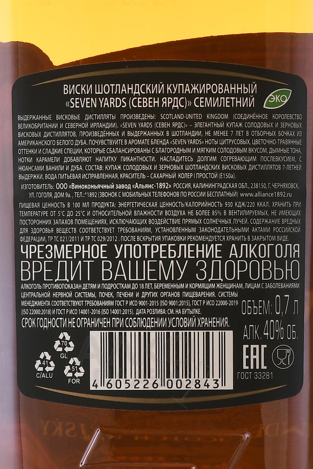 Виски Seven Yards 7 лет 0,7 л в тубе — это купажированный скотч, созданный по традиционной технологии. После перегонки спирты, входящие в состав бленда, на протяжении семи лет дистилляты хранились в дубовых бочках из-под бурбона. Название отражает высоту склада, где бочки можно было ставить в семь ярусов — «yards» по-английски.
