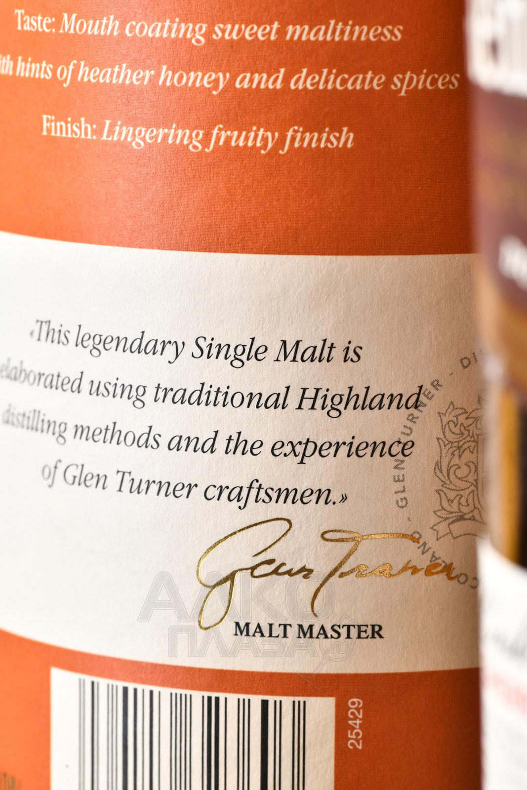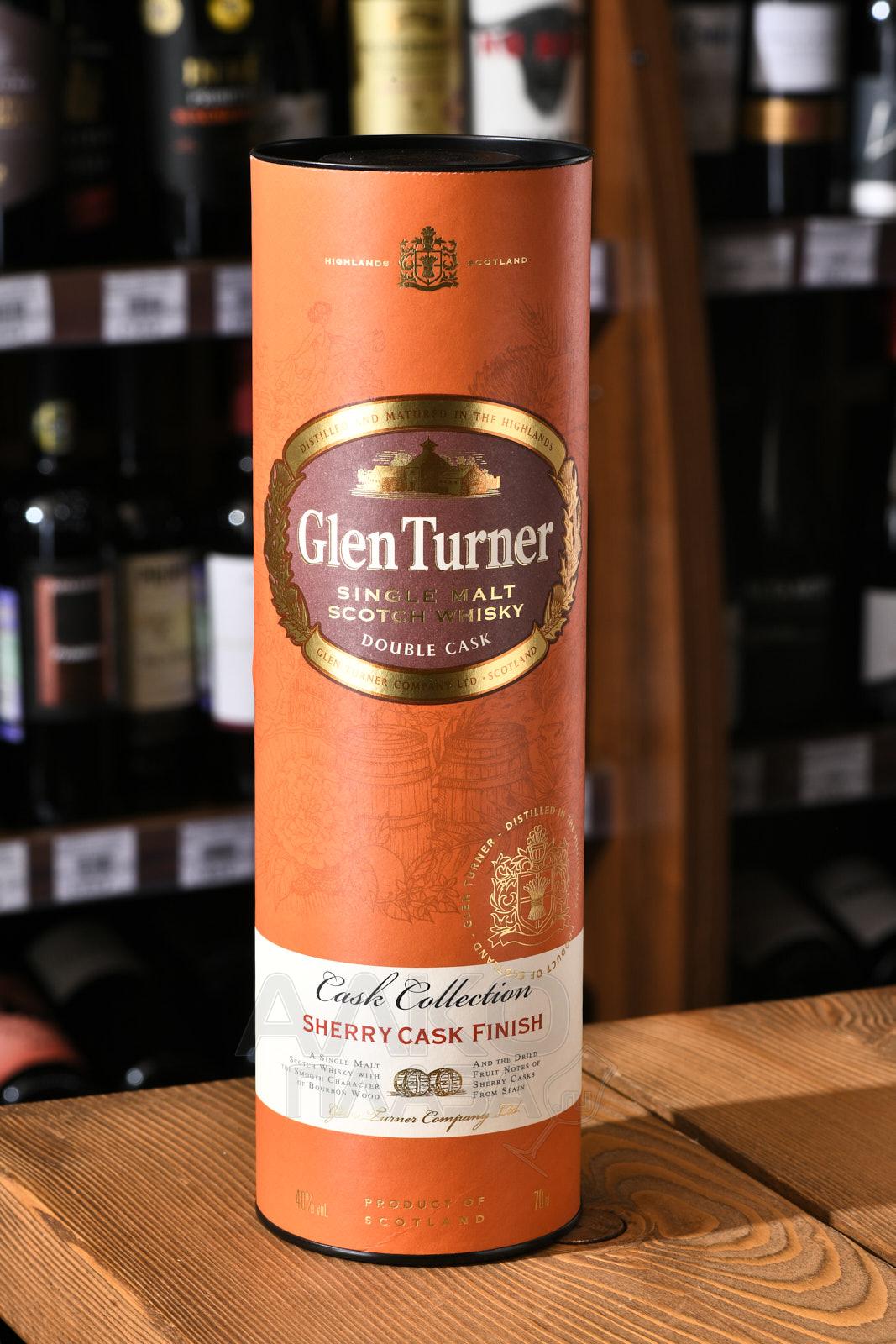 Виски Single Malt Glen Turner Sherry Cask Finish — сорокаградусный скотч из шотландского региона Highland, который содержит в основе отборные ячменные спирты, произведенные традиционным способом в рамках одного предприятия. Сырье подверглось соложению и перегонке, после чего его поместили в бочонки из-под бурбона. На завершающем этапе виски вызревал в хересных барриках. Общий срок выдержки составил не менее четырех лет. Высококачественный напиток предлагается в бутылках 0,7 л, укомплектованных сувенирными тубами с логотипом производителя.