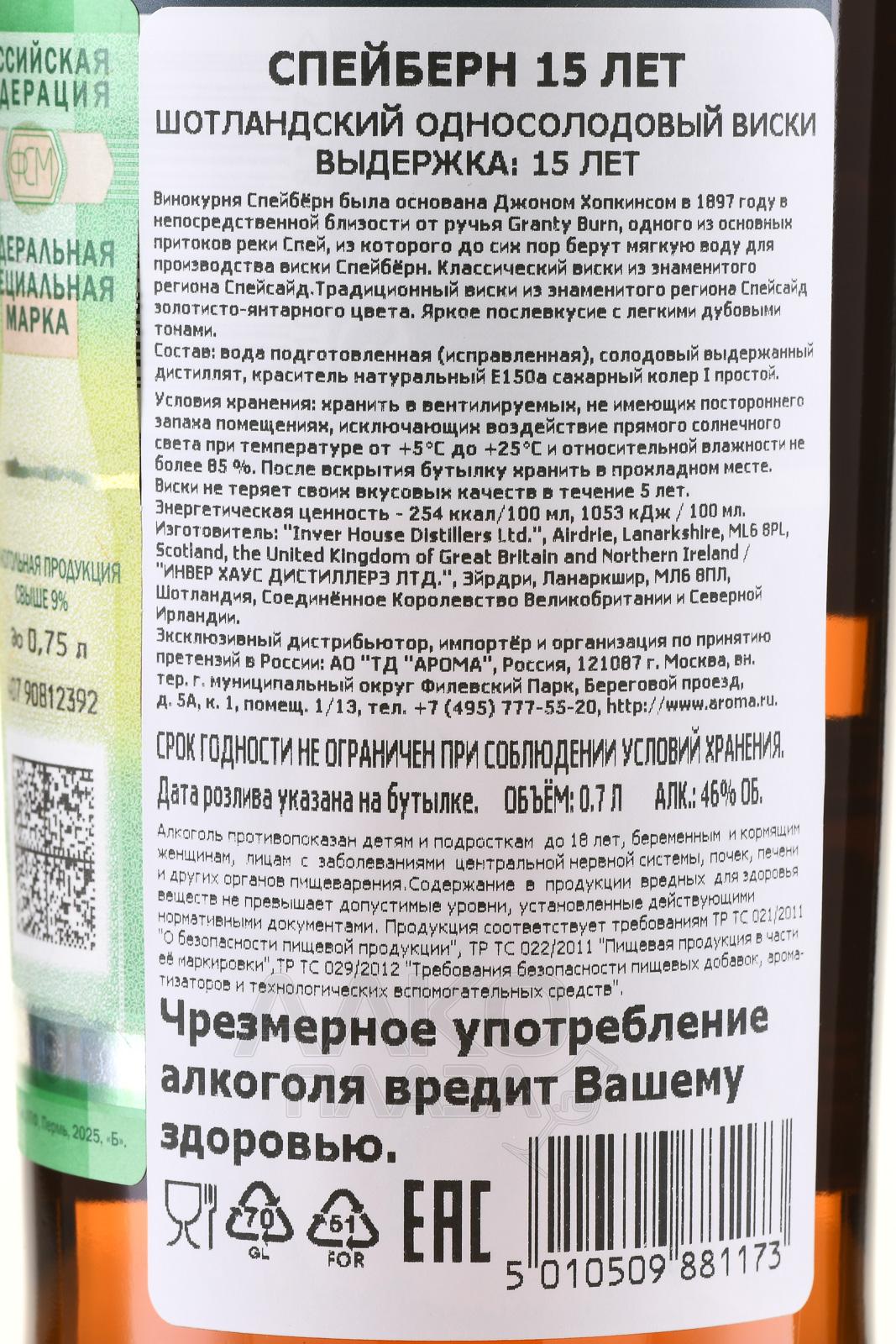 15-летний односолодовый виски с винокурни Speyburn, представленный в их ассортименте во второй половине 2017 года. Выдержанный в сочетании американских и испанских дубовых бочек в течение 15 лет, этот релиз особенно сливочный и яркий.