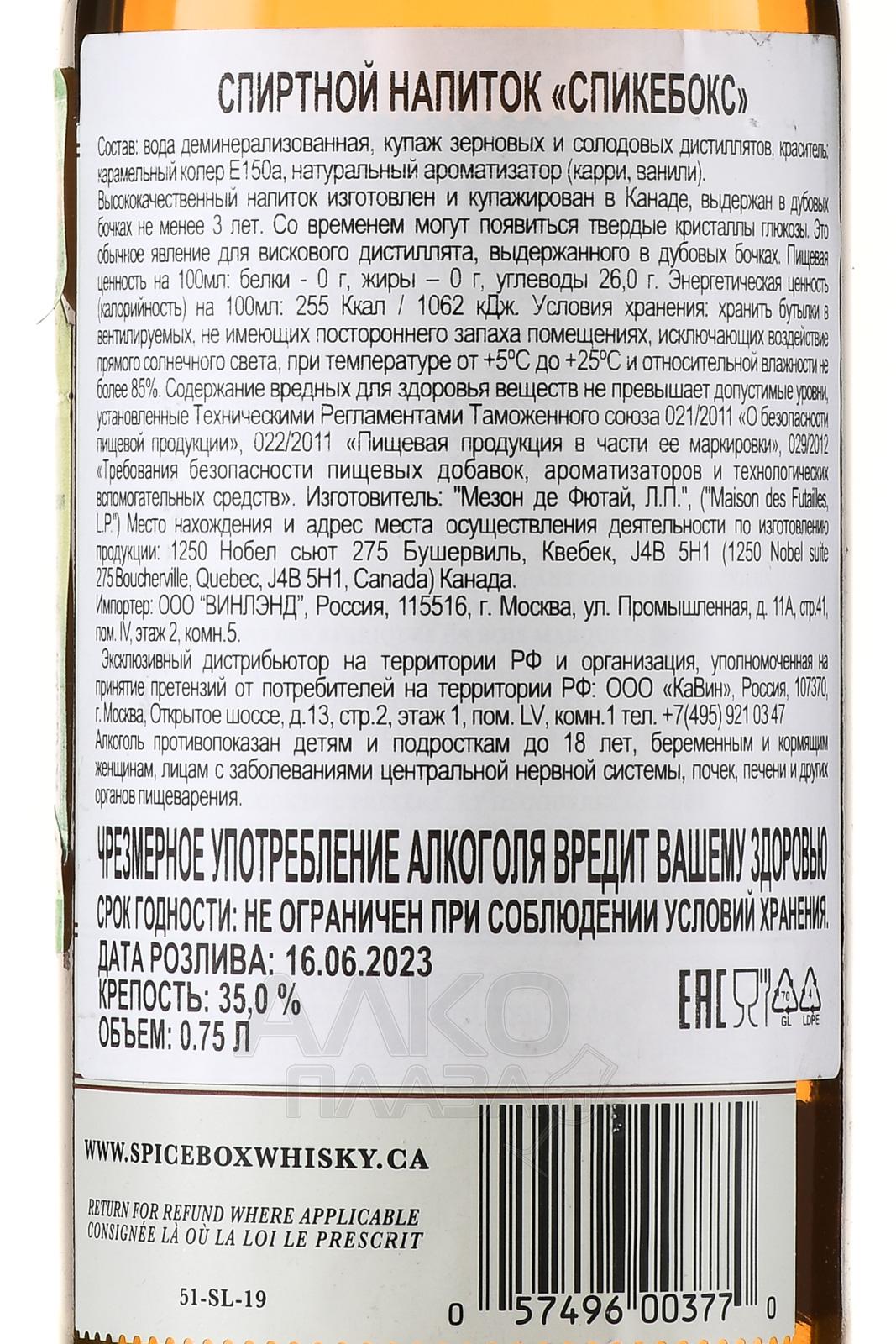 Spicebox ( Спикебокс ) - приятный виски с тонкими ароматами ванили, весеннего цветения и нежной нотой спелых цитрусовых. Станет отличным сопровождением вашего отдыха, можно как смешивать, так и в чистом виде со льдом.