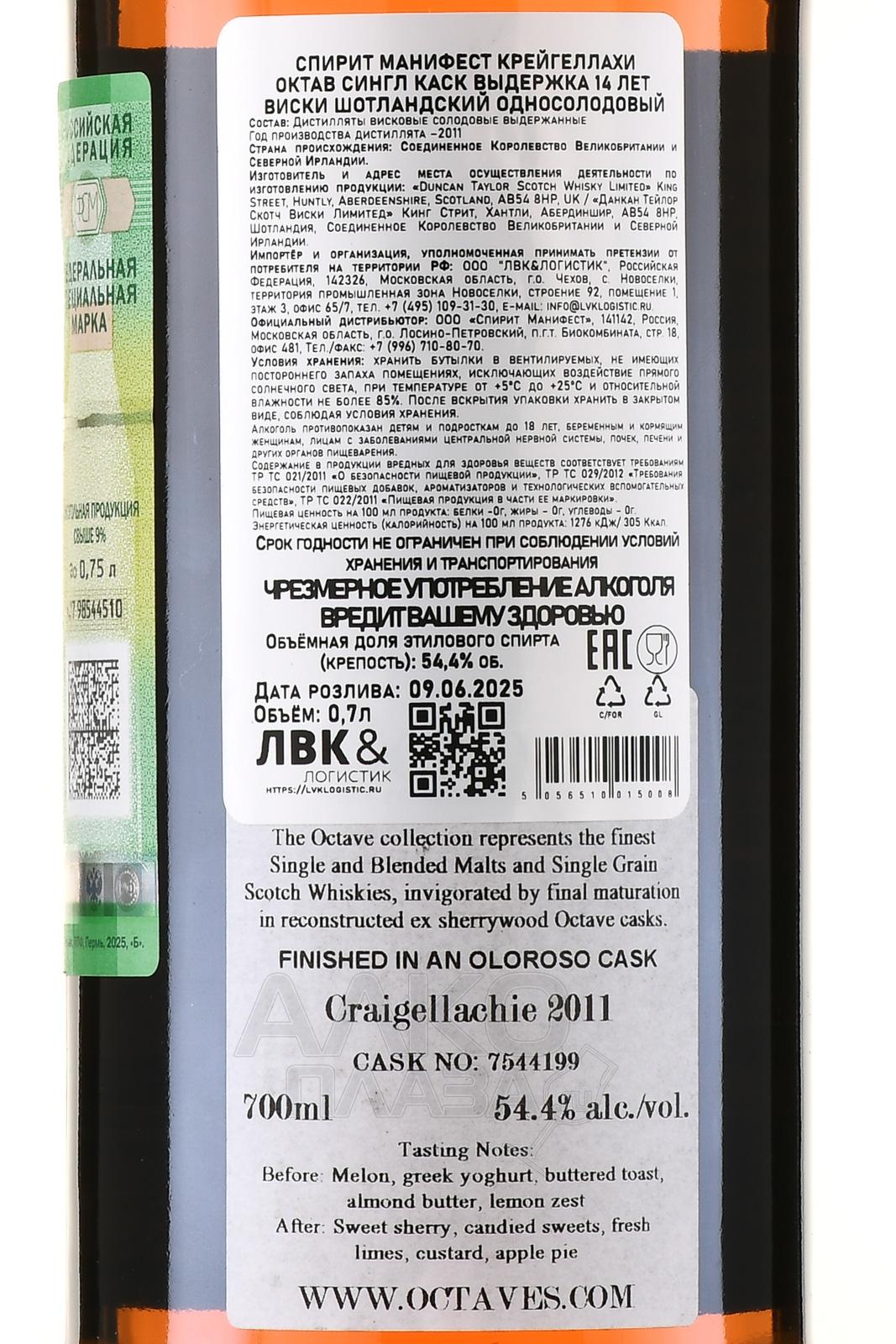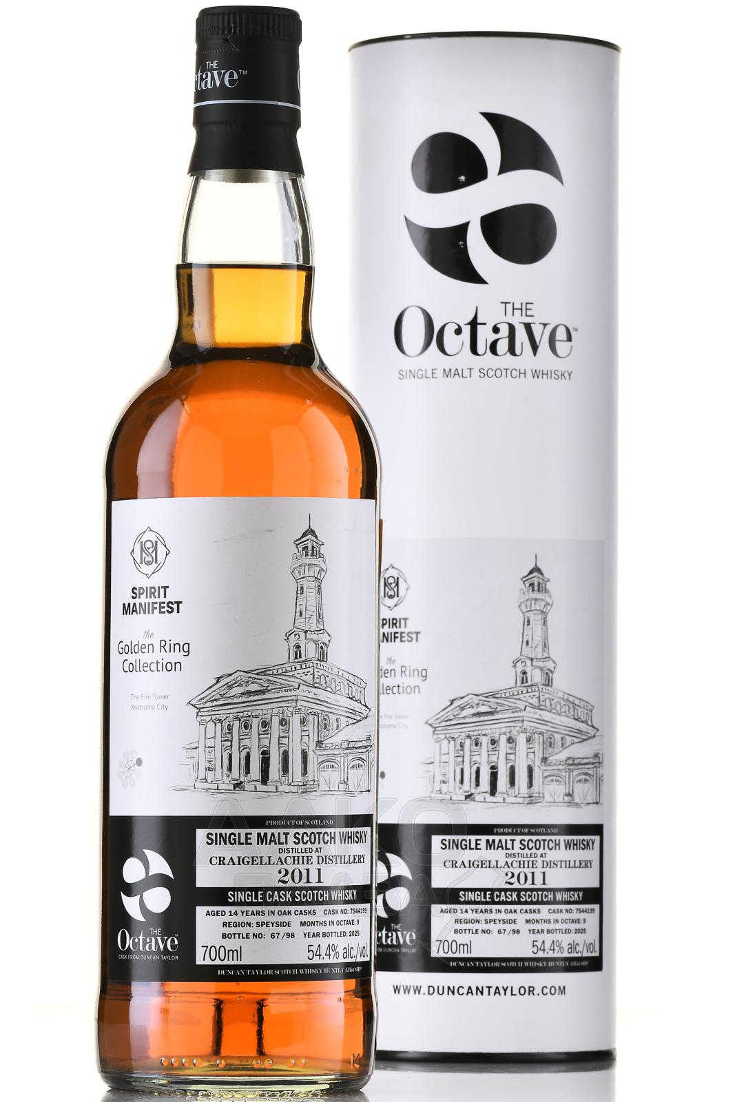 Виски Duncan Taylor Spirit Manifest The Octave Craigellachie 14 лет 0,7 л в тубе — это редкий релиз, созданный из спиртов дистиллерии Крейгеллахи, расположенной в центральной части Спейсайда. Местные воды и характерный для региона стиль дают плотный, насыщенный дистиллят. Напиток выдержан 14 лет, а финальный этап созревания проходит в бочонках формата «октава». Их малый объём ускоряет взаимодействие спирта и древесины, усиливает глубину и добавляет яркие древесные мотивы. Как и остальные образцы серии, этот скотч создаётся вручную: каждая бочка проходит индивидуальную проверку, финальный купаж не корректируется, холодная фильтрация не используется. Это позволяет сохранить естественную структуру и выразительный характер спиртного.