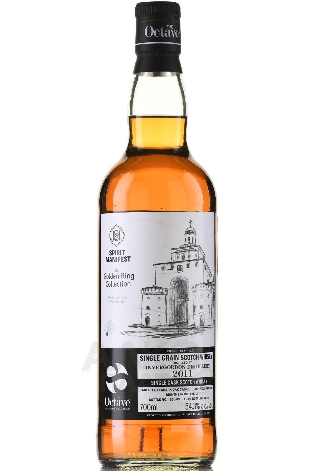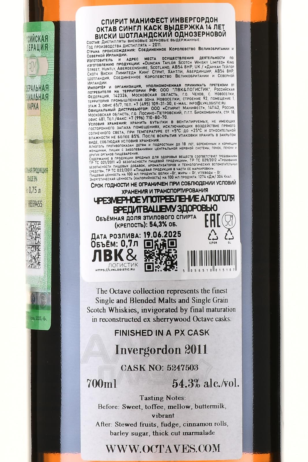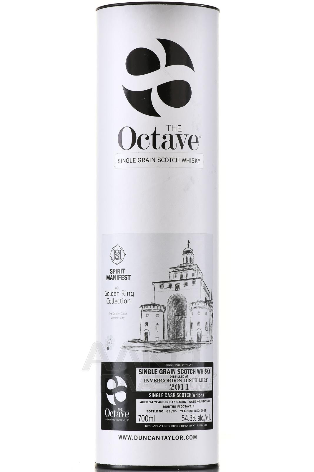 Виски Duncan Taylor Spirit Manifest The Octave Invergordon 14 лет 0,7 л в тубе представляет редкую интерпретацию стиля северной Шотландии. Основу составляет зерновой спирт, произведённый на винокурне Инвергордон, расположенной на побережье Кромарти. Здесь воздух влажный и прохладный, а склады для выдержки находятся недалеко от морской линии, благодаря чему спирты испаряются постепенно, набирая яркий аромат. Дистиллят проходит путь от классической перегонки до длительной выдержки в течение 14 лет. Финальный этап — перевод партии в небольшие дубовые бочки формата octave объёмом около 50 литров. Из-за высокой площади контакта древесины напиток получает повышенную концентрацию, глубокий цвет и плотную текстуру. Каждая партия выпускается в ограниченном количестве, что подчёркивает коллекционный статус серии Спирит Манифест.