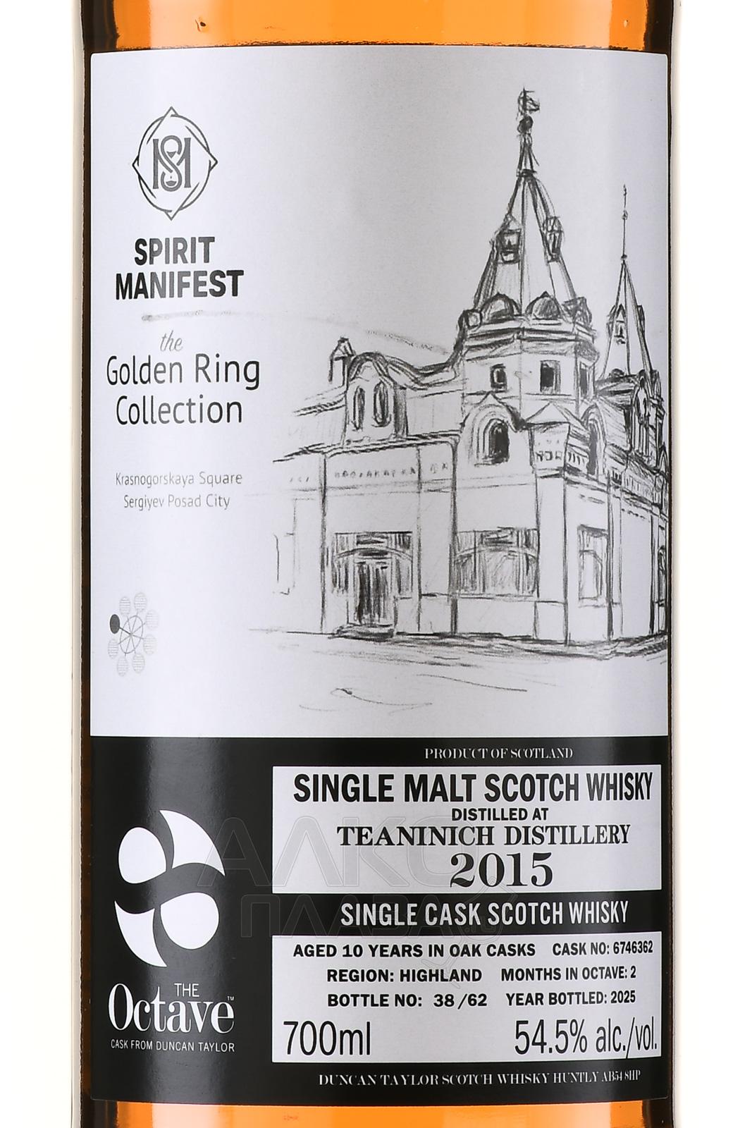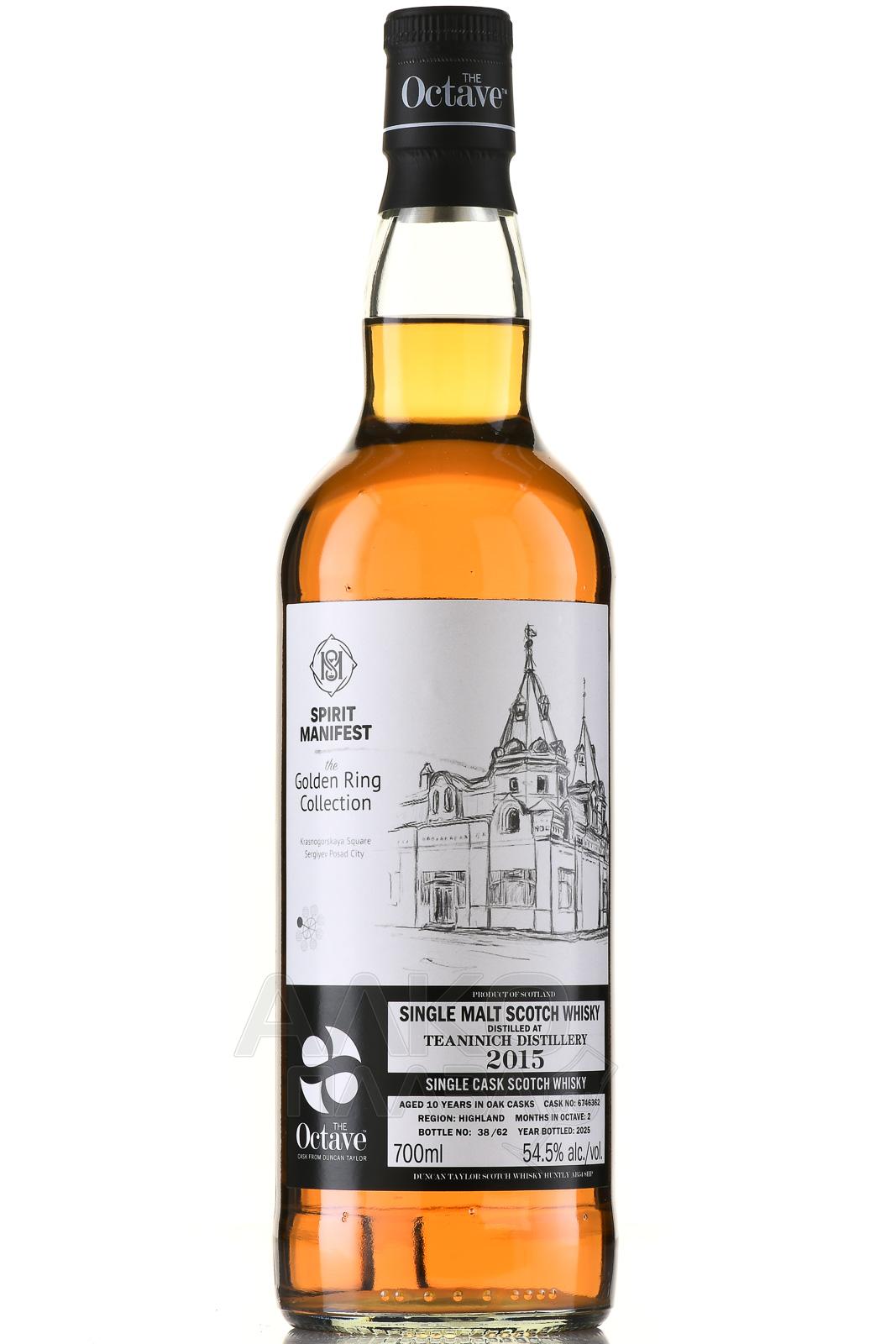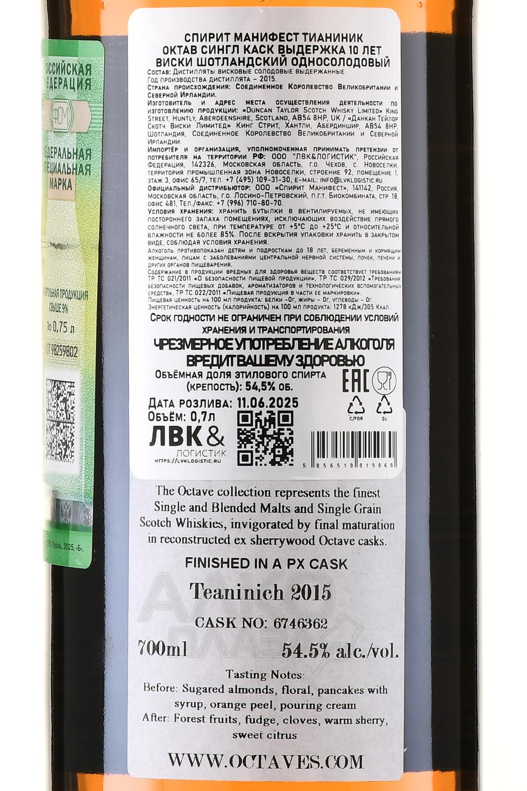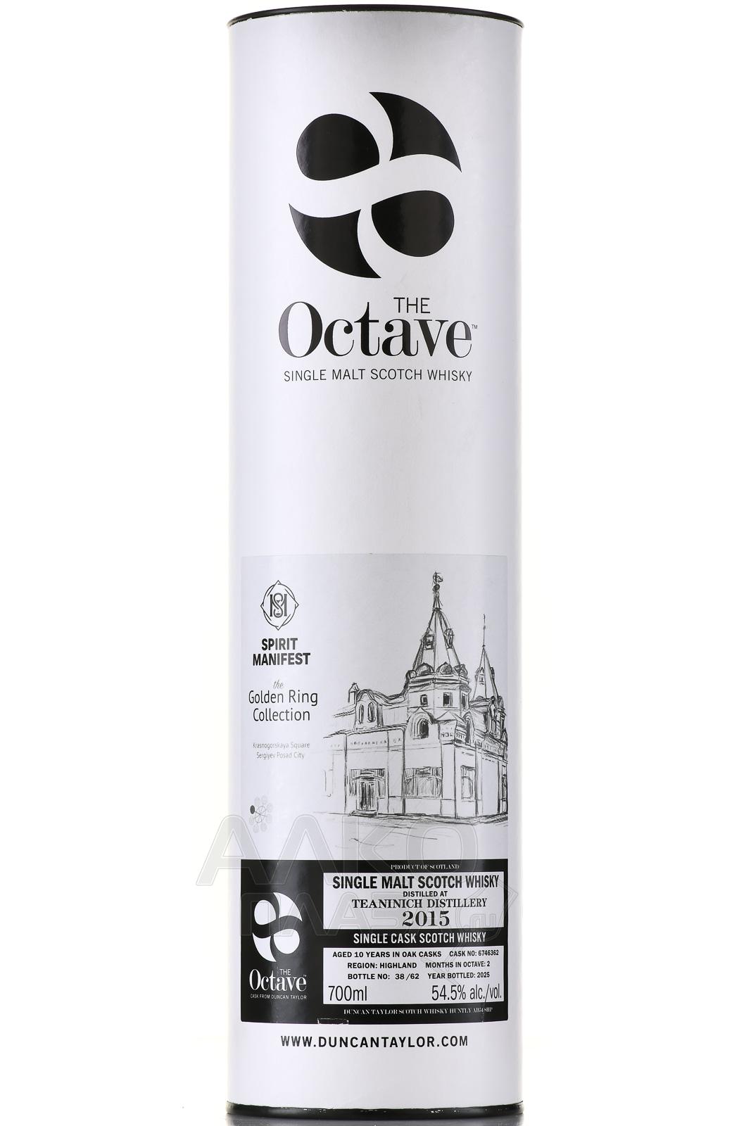 Виски Duncan Taylor Spirit Manifest The Octave Teaninich 10 лет 0,7 л в тубе создаётся на северо-востоке Шотландии, в зоне Хайленд, на возвышенных равнинах недалеко от побережья. Климат здесь прохладный, с частыми туманами и влажными ветрами, что влияет на равномерное дозревание спиртов в складах. Для производства используют классическую перегонку в крупных кубах, дающую чистый и гибкий дистиллят. Первичная выдержка длится около десяти лет в стандартных бочках, после чего партия переводится в небольшие ёмкости формата «октава» объёмом около 50 литров. Из-за высокой площади контакта дистиллята с древесиной напиток быстро насыщается цветом и глубокими тонами, а его структура становится плотнее. Серия Спирит Манифест представлена малыми тиражами, поэтому каждая бочка даёт уникальный профиль, подчёркивая традиции работы компании с редкими спиртами.