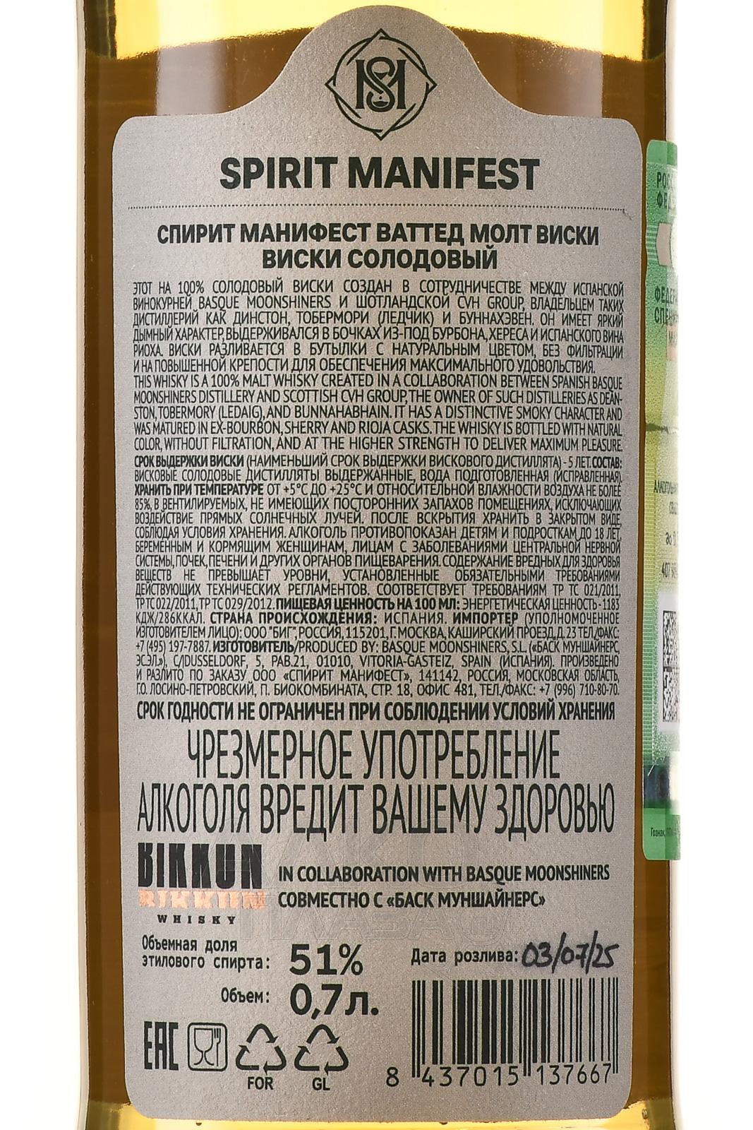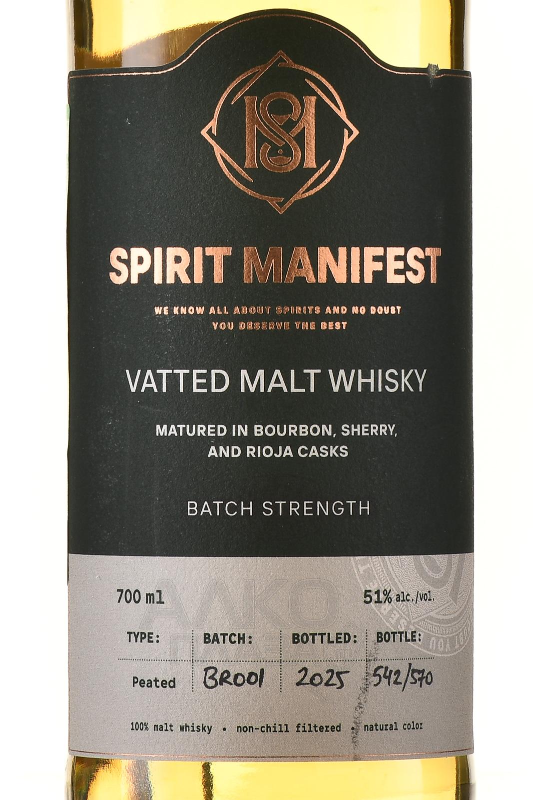 Виски Spirit Manifest Vatted Malt 0,7 л представляет собой купаж солодовых дистиллятов из разных регионов Шотландии, объединенных для создания цельного стиля с мягким характером. В состав входят спирты из ячменного солода, прошедшие медленную перегонку в медных кубах и выдержку в дубовых бочках разного объема. Тщательный подбор партий обеспечивает сложный характер молта, сочетающего в своей органолептике плотность Хайленда, фруктовые мотивы Спейсайда и легкий теплый акцент древесины, характерный для бочек, использовавшихся ранее под херес, бурбон и испанское красное вино. Также в формировании характера напитка имеет значение возраст дистиллятов — от 8 до 12 лет.