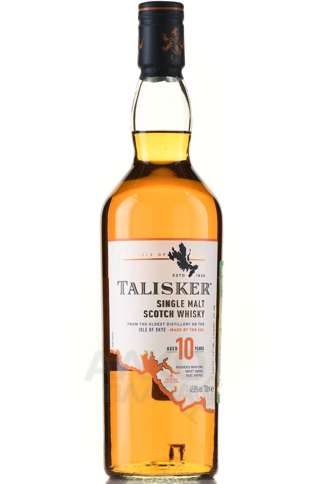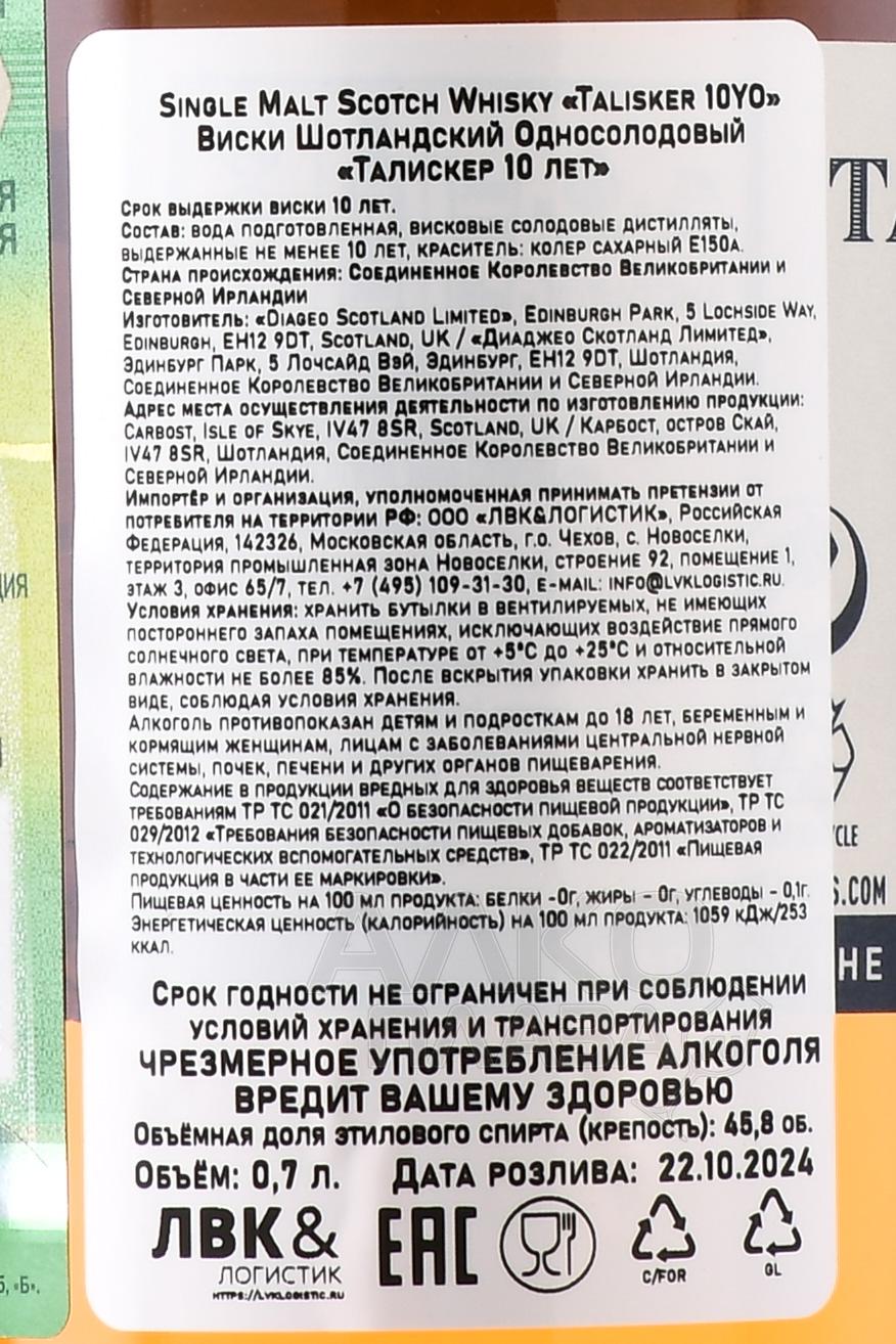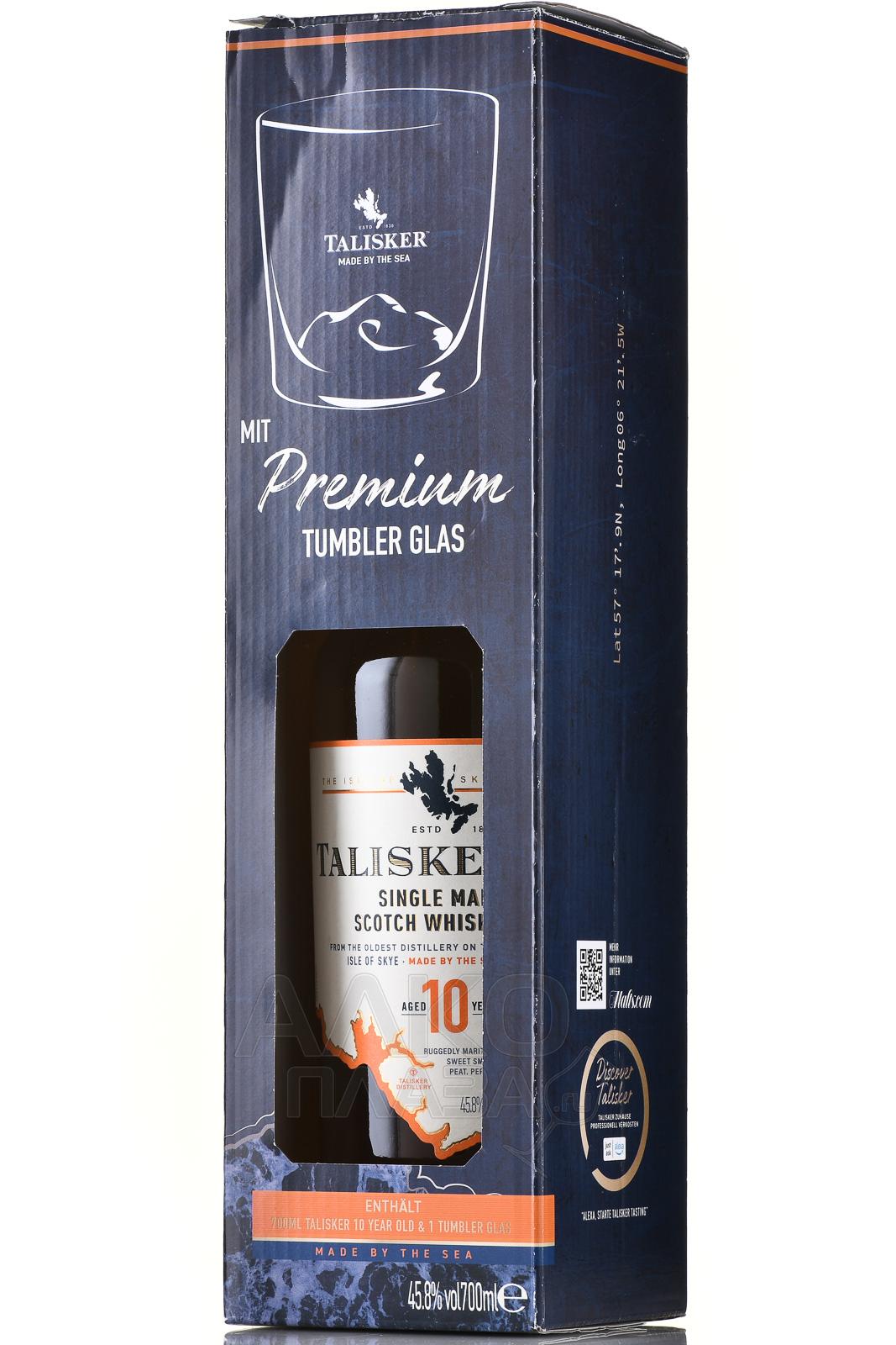Виски Talisker 10 Years Old 0,75 л в п/у со стаканом — односолодовый шотландский релиз, созданный на острове Скай, где суровый морской климат и близость Атлантики формируют узнаваемый характер спиртов. Основой служит ячменный солод, высушенный с применением торфа. Брожение сусла проходит с использованием дрожжей, после чего следует перегонка в медных кубах. Выдержка продолжается не менее десяти лет в дубовых бочках, ранее использовавшихся для бурбона. Букет напитка складывается под влиянием островного происхождения, морского воздуха и продолжительного контакта с древесиной. При розливе фенольный уровень не превышает 20 ppm, а бутилируется скотч без фильтрации, сохраняя свой яркий характер. Подарочная упаковка дополнена стаканом, подходящим для неспешной дегустации.