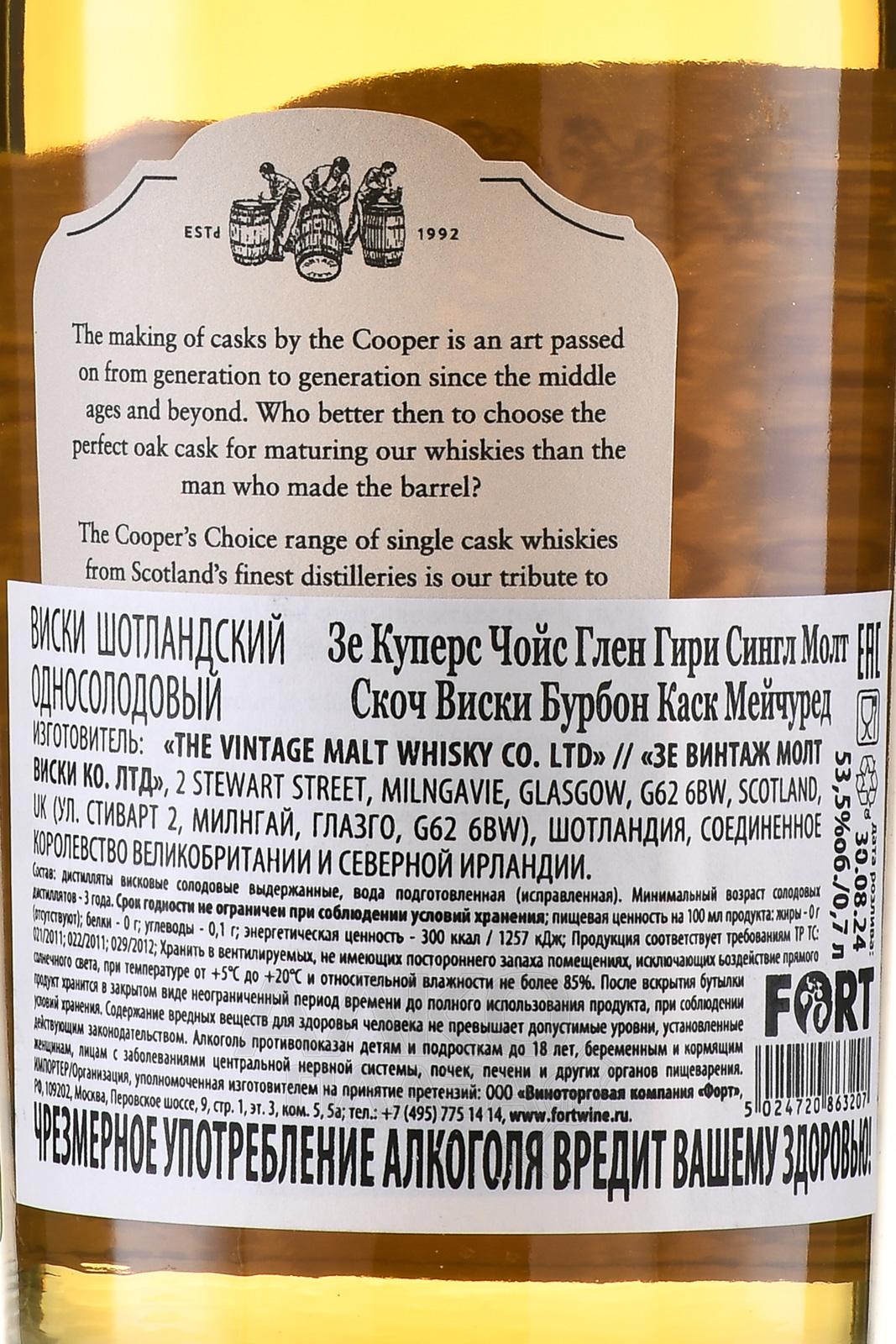 Виски The Cooper`s Choice Glen Garioch Single Malt Bourbon Cask Matured 0,7 л в п/у – это редкий образец от одной из старейших дистиллерий Шотландии, основанной в конце XVIII века. Напиток произведен из ячменного солода, который после дробления и затирания прошел медленную перегонку в медных кубах. Полученный спирт созревал в дубовых бочках из-под бурбона, что придало ему гармоничный баланс между сладостью и сухими древесными акцентами. Глен Гири характеризуется более плотным телом по сравнению с другими скотчами региона Хайленд, а выдержка в дубе сохранила его характерную маслянистость, усилив при этом фруктовую составляющую. Релиз вышел ограниченным тиражом. Перед розливом он не подвергается холодной фильтрации, благодаря чему сохраняет естественную структуру и насыщенность.