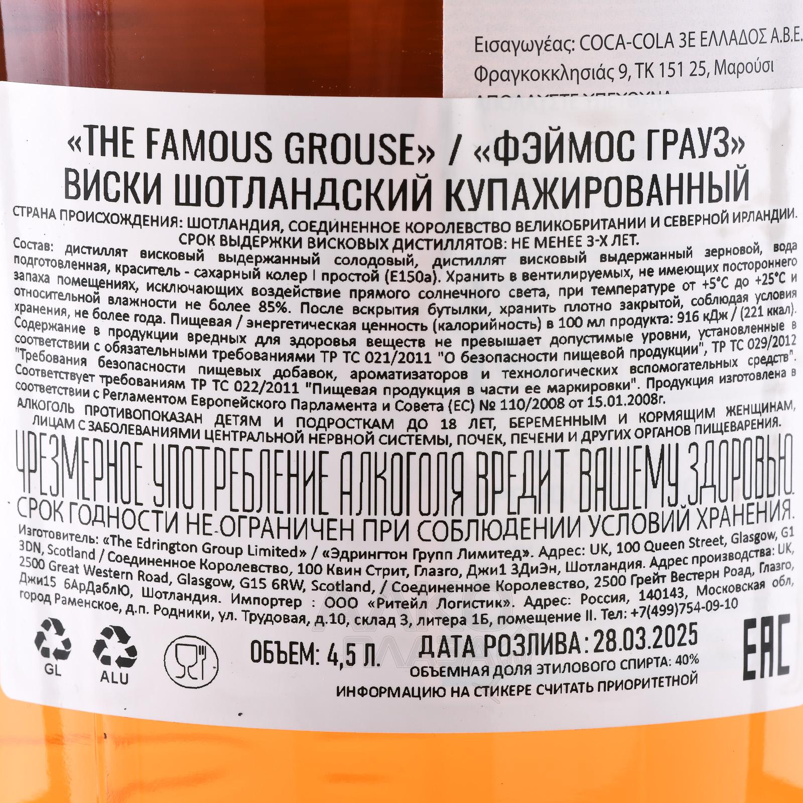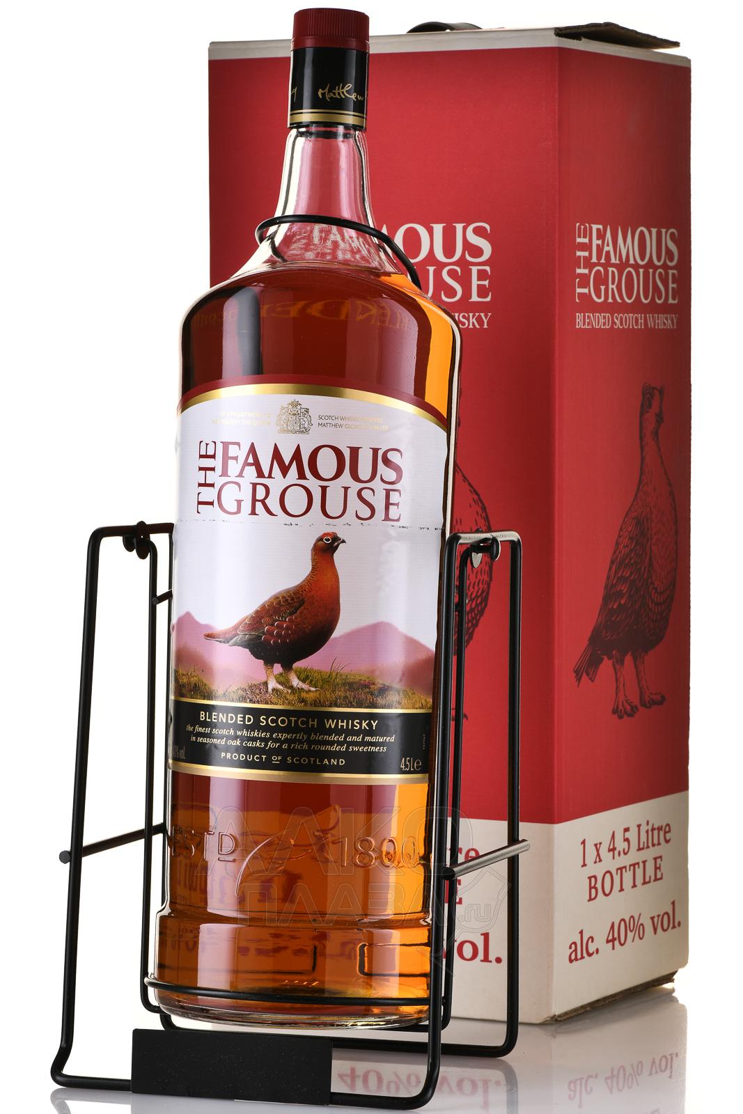 Виски The Famous Grouse 4,5 л в п/у качели привлекает внимание солидным форматом, что делает этот скотч оригинальным подарком и коллекционным экземпляром. По составу это бленд, созданный из тщательно отобранных солодовых и зерновых спиртов, выдержанных не менее 3 лет. Напиток производится в Шотландии по традиционной технологии с использованием дистиллятов Highland Park и The Macallan. Сочетание длительной выдержки и мастерского купажа делает виски гармоничным, мягким и узнаваемым. The Famous Grouse неоднократно получал высокие оценки дегустаторов и входит в число самых популярных скотчей в мире.