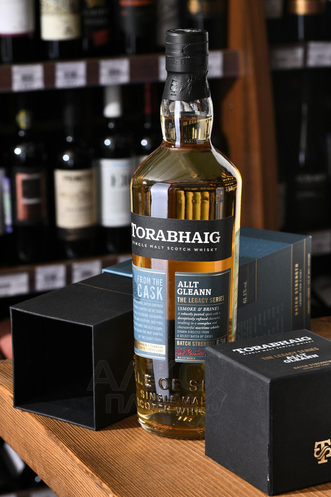 Виски Torabhaig Single Malt Scotch Whisky Legacy Series Allt Gleann Batch Strength 0,7 л в п/у - подарочный релиз спиртного от винокурни с шотландского острова Скай. Мастера компании выработали свой собственный стиль, который они охарактеризовали как «Хорошо темперированный торф» («Well-Tempered Peat»). Напиток получают купажированием солодовых спиртов из зерна, обработанного с применением сушки над торфяным дымом. Скотч разлили при бочковой крепости после 5-летней выдержки в емкостях из-под бурбона и виски, не подвергая фильтрации и подкрашиванию карамелью. Остаточный уровень фенолов в спиртном составил 17-22 ppm, а уровень алкоголя – 61,1%.