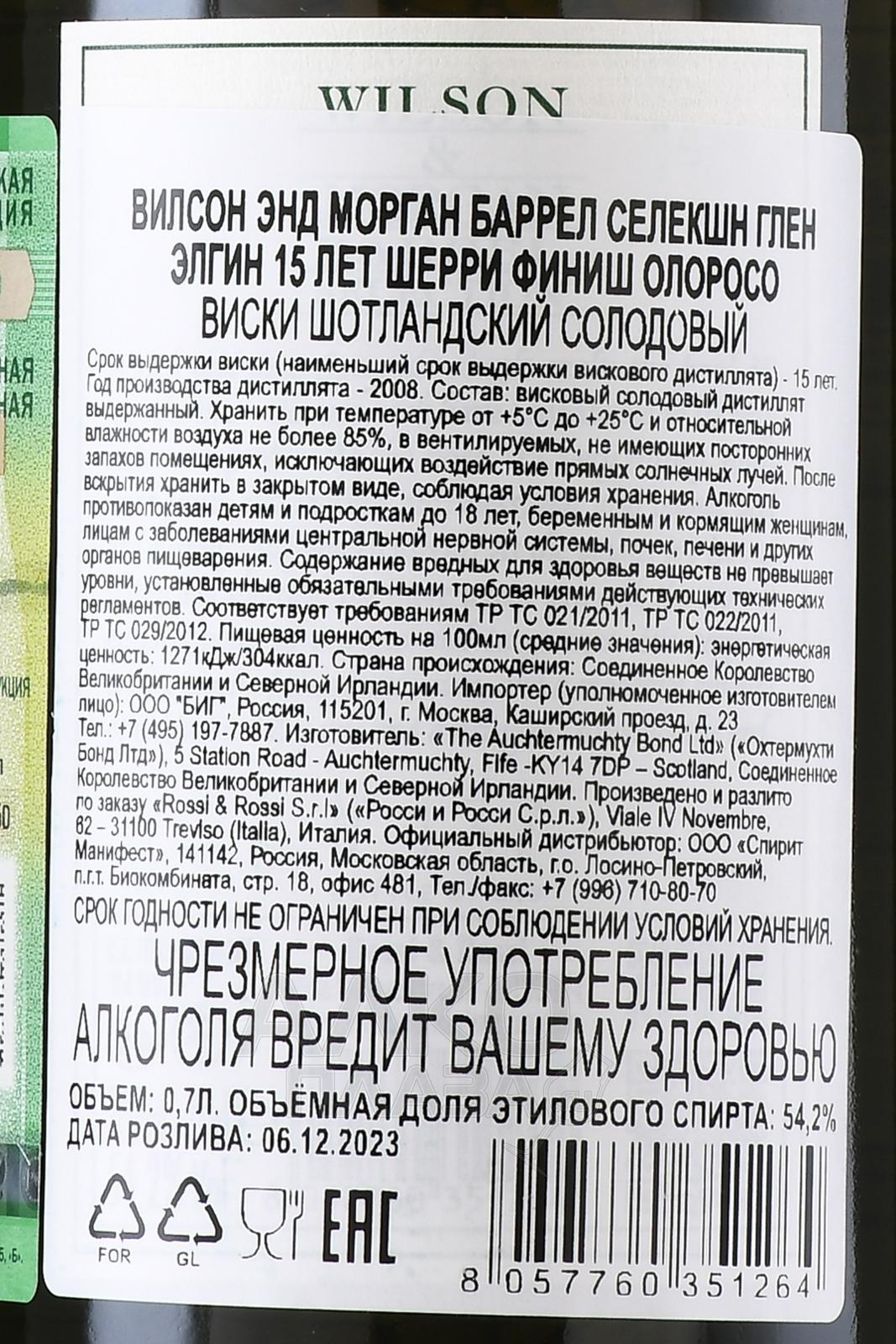 Wilson & Morgan Barrel Selection Glen Elgin Sherry Cask Finish Oloroso 15 Years Old - виски Вилсон энд Морган Баррел Селекшн Глен Элгин 15 лет Шерри Финиш Олоросо 0.7 л п/у