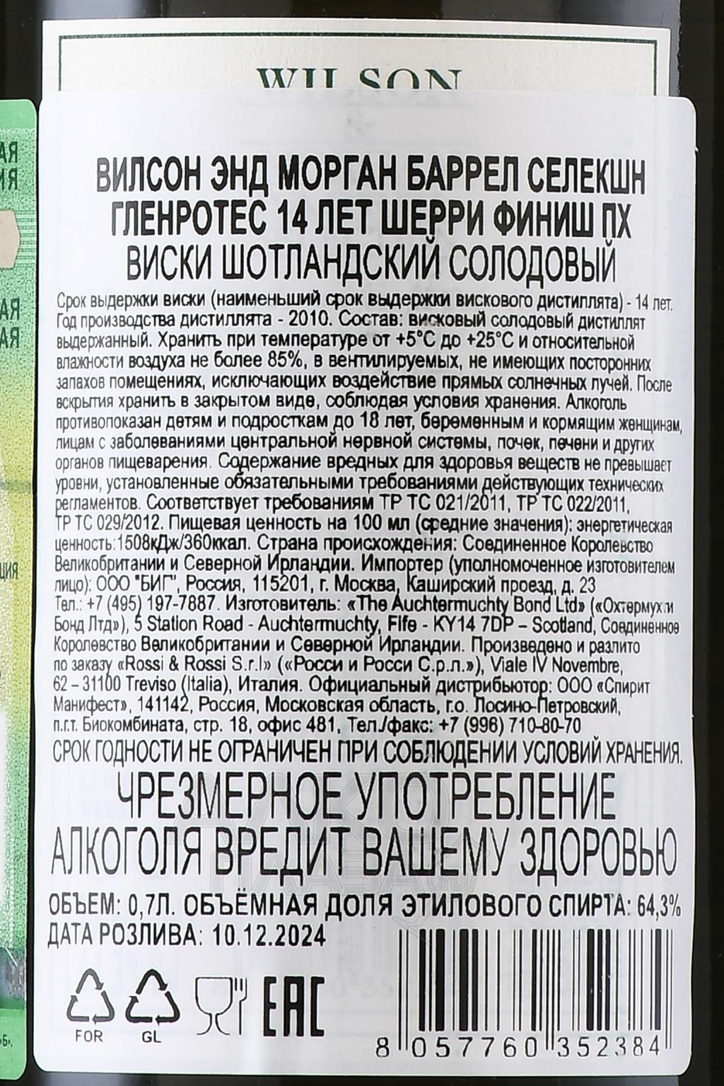 Wilson & Morgan Barrel Selection Glenrothes Sherry Finish PX 14 Years Old - виски Вилсон энд Морган Баррел Селекшн Гленротес Шерри Финиш ПХ 14 лет 0.7 л в п/у