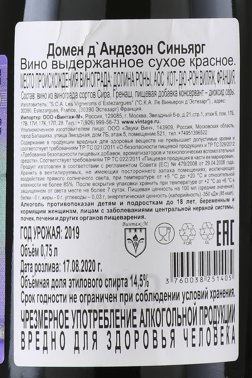 / Domaine d Andezon Сайт alcoplaza.ru содержит информацию, не рекомендованную для лиц, которые не достигли возраста 18 лет. Чтобы осуществить вход на сайт, Вам необходимо подтвердить свой совершеннолетний возраст. Сведения, размещенные на сайте , не являются рекламой, носят исключительно информационный характер, и предназначены только для личного использования. Информация на сайте не является публичной офертой.